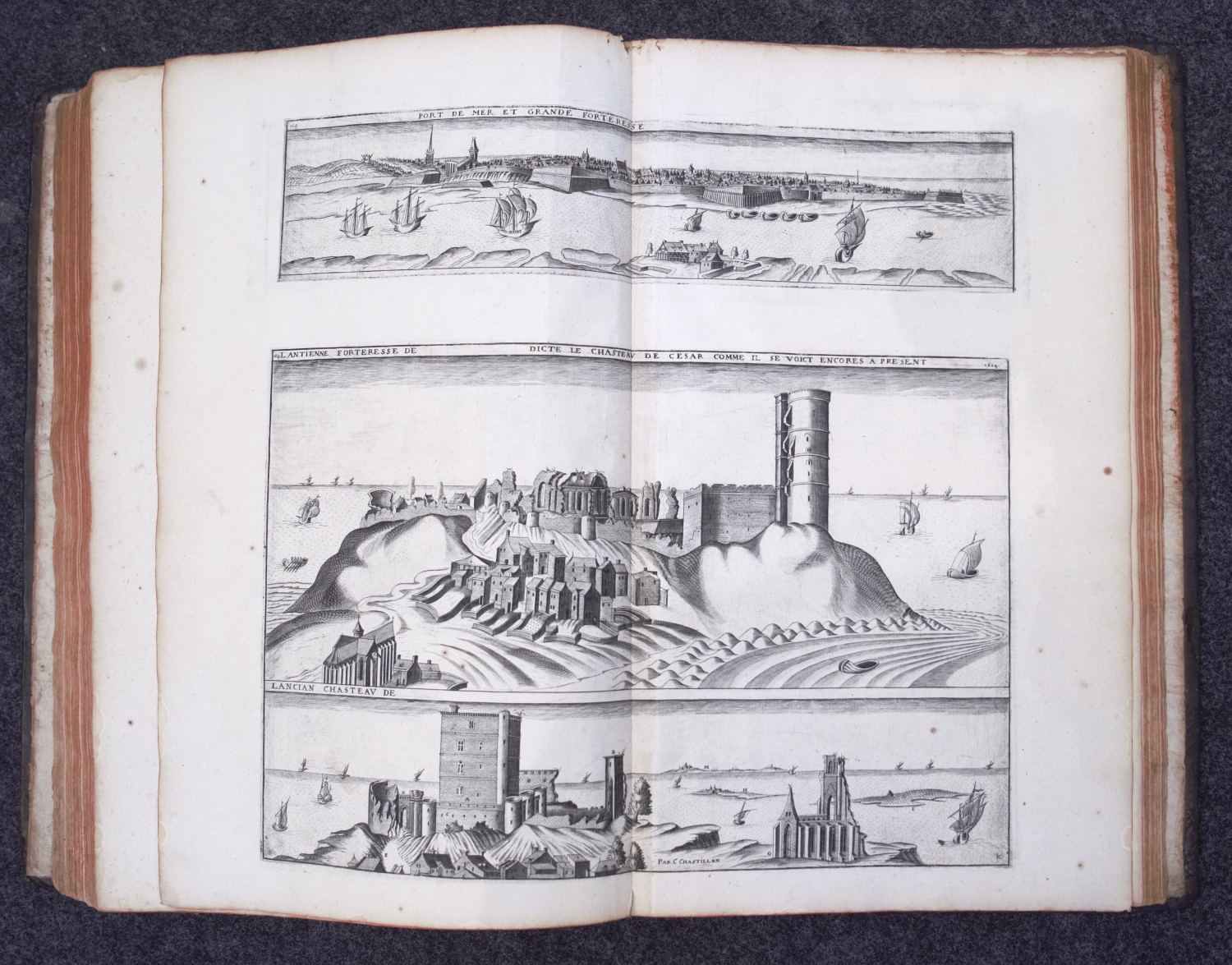 Chastillon, Claude. Topographie françoise ou representations de plusieurs villes, bourgs, chasteaux, maisons de plaisance, ruines & vestiges d'antiquitez du royaume de France. 1 Bl. (Inhalt). Mit Kupfertitel, 157 Tafeln mit je 2 Kupfern, 45 doppelblattgroßen Kupfertafeln und 10 gefalteten Kupfertafeln. 44,5 x 28,5 cm. Leder d. Z. (stärker berieben und mit Schab- oder Kratzspuren, Rücken fachmännisch unter Verwendung alten Bezugsmaterials restauriert) mit RVergoldung und goldgeprägtem RTitel. Paris, Jean Boisseau, 1641.