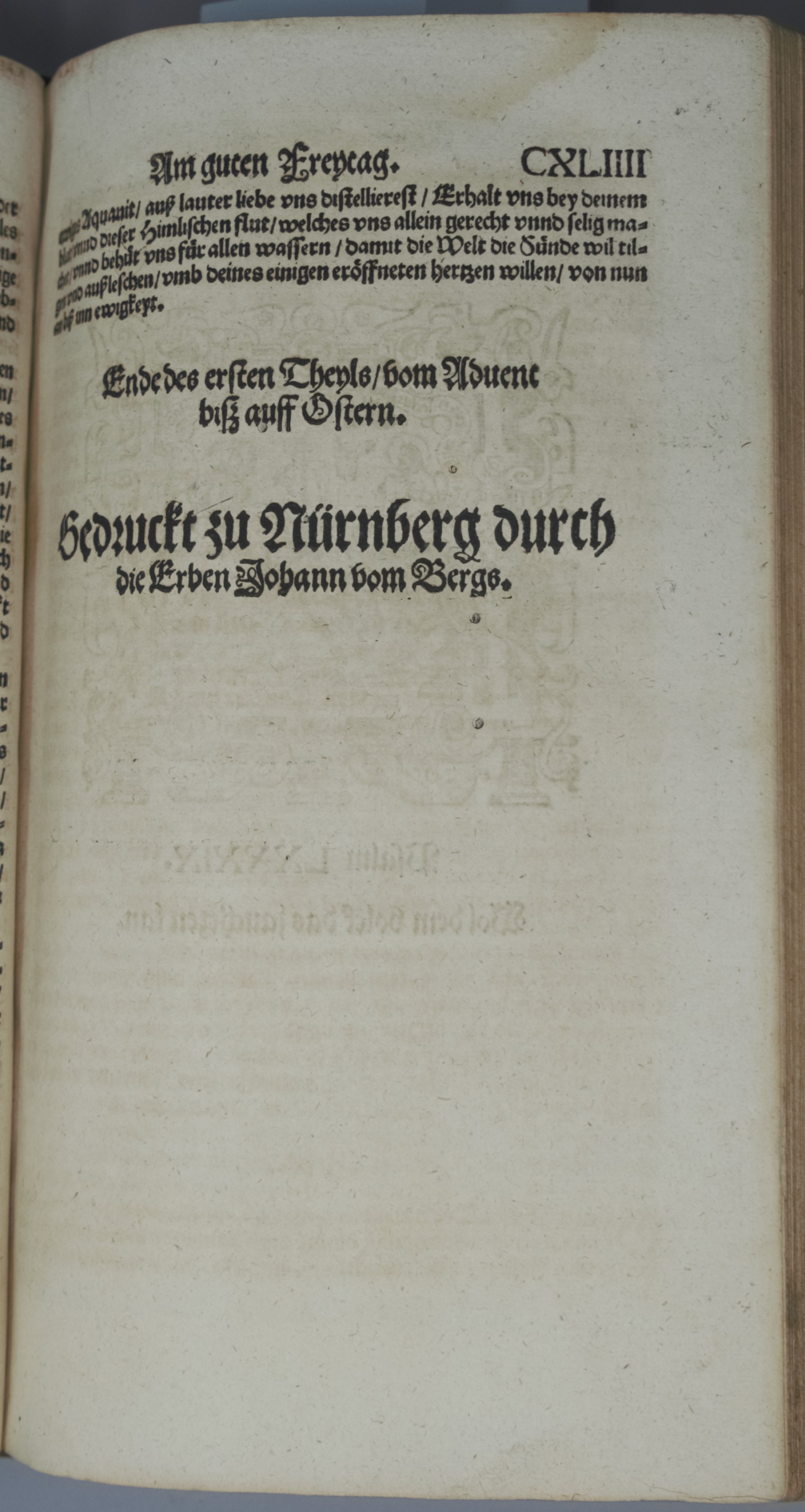 Vgl. VD16 M 1534 und 1535 (ohne Digitalisat bzw. Kollation). – Wohl eine Mischauflage der vierteiligen Evangelien-Postille des "Bergpredigers" von Joachimsthal in Böhmen Johannes Mathesius (1504-1565), ein "Muster protestantischer Kanzelberedsamkeit" (NDB XVI, 369). Mathesius war 1540 für zwei Jahre in Wittenberg, wo er in engem Kontakt mit Luther stand und dessen Tischreden und Predigten dokumentierte.    – Titel mit hs. Besitzvermerk ("Benedicti Meisneri 88"), fl. Vorsatz mit mehreren zeitgenössischen Einträgen. Insgesamt etwas angestaubt und fleckig, mehrere Blatt zumeist am Schluss auch mit Feuchtigkeitsrand im oberen Bug, das Papier dort etwas brüchig. Anfangs leicht wurmstichig.