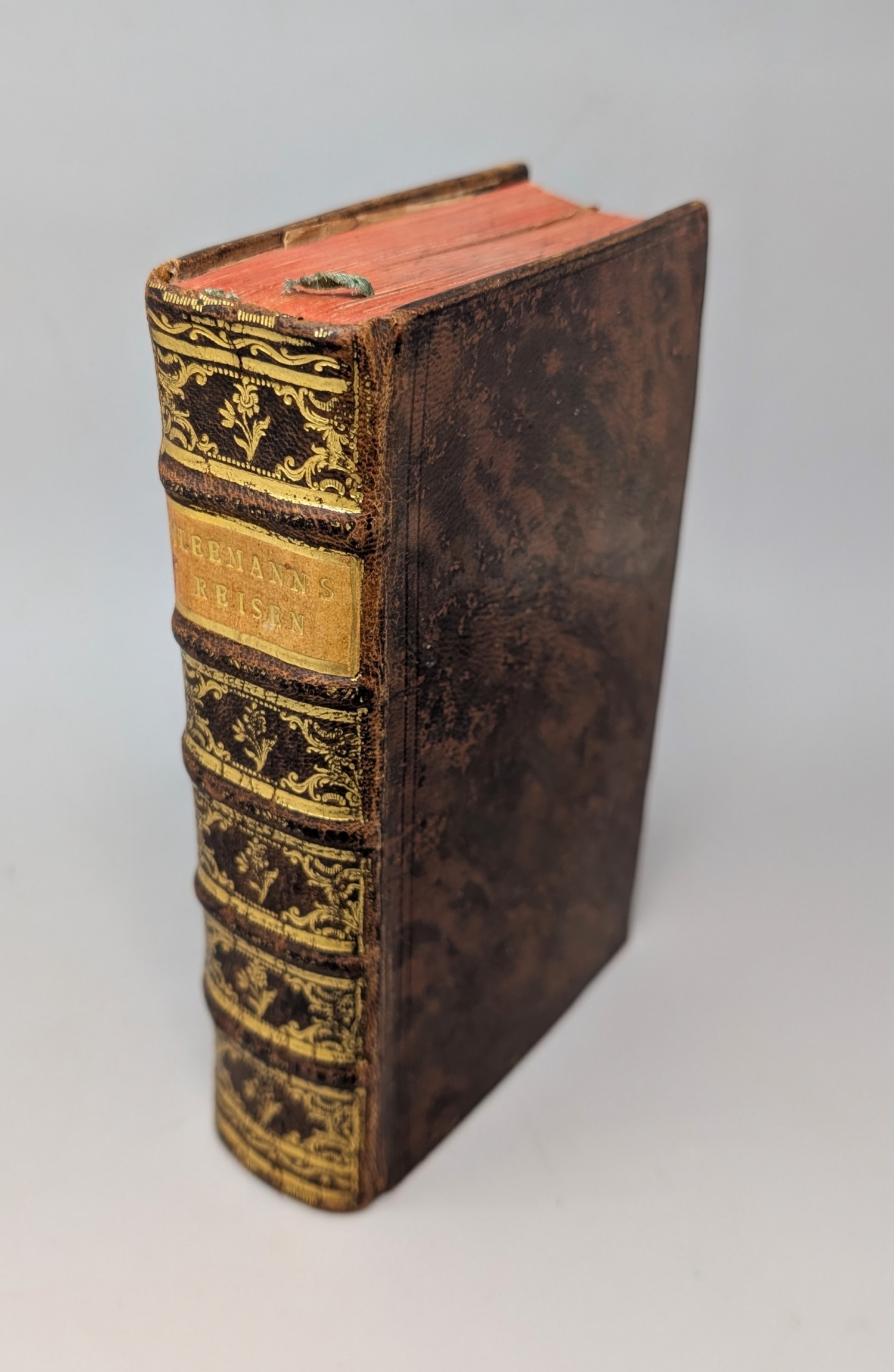 Kleemann, N(ikolaus) E(rnst). Tagebuch der Reisen. Dritte vermehrte Auflage. 11 Bl., VI S., 1 Bl., 388 S., 1 Bl. Mit gestochener Titelvignette, 11 gefalteten Kupfertafeln und gefalteter Kupferstichkarte. 17 x 10,5 cm. Marmorierter Lederband d. Z. (schwach berieben) mit reicher ornamentaler RVergoldung und goldgeprägtem RSchild. Prag, Schönfeld, 1783.