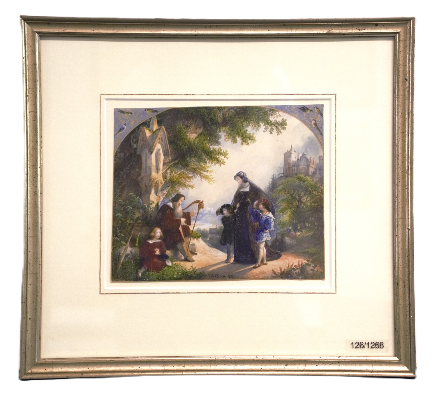 Romantische Landschaftsdarstellung mit einem bärtigen Sänger mit Harfe unter einem Bildstock mit Madonnenfigur, zu seinen Füßen ein Knabe in altdeutscher Tracht. Seinem Gesang lauscht eine Edelfrau in Begleitung ihrer beiden Knaben. Die landschaftliche Szenerei gibt den Blick frei auf ein Flusstal mit verschneiten Bergen im Hintergrund. Die oberen Zwickel reich verziert mit Vögeln und Rankenwerk auf blauem Grund. – Wohlerhalten.