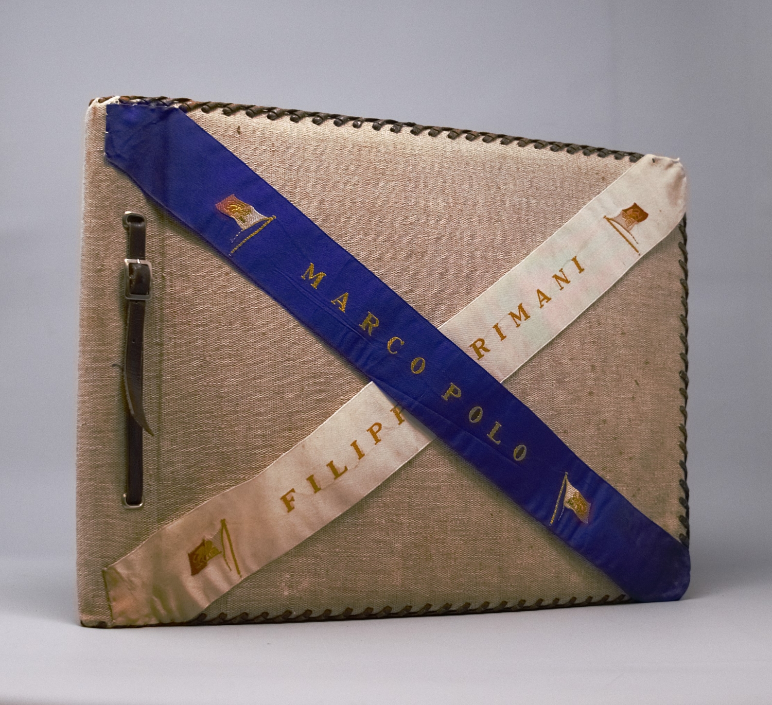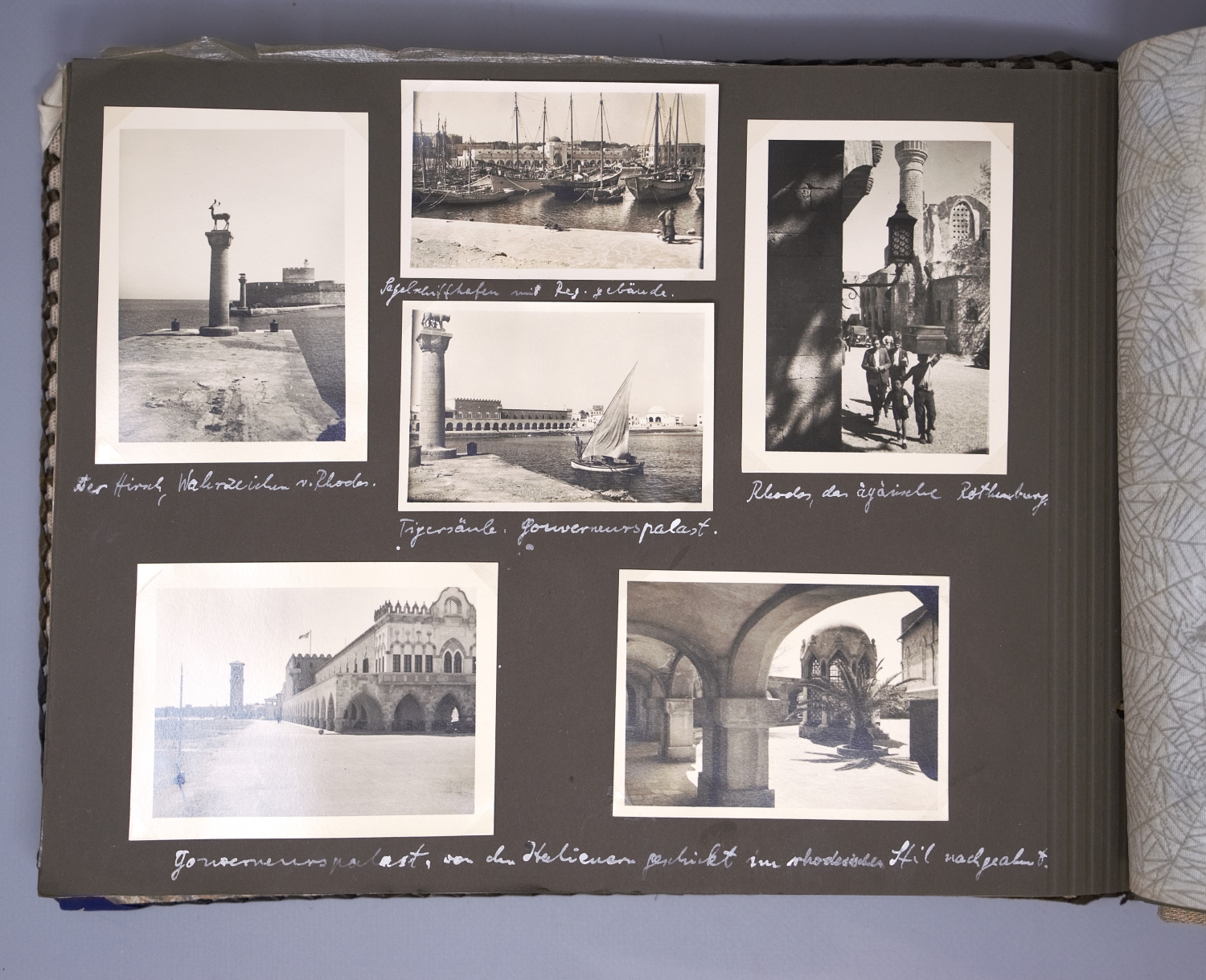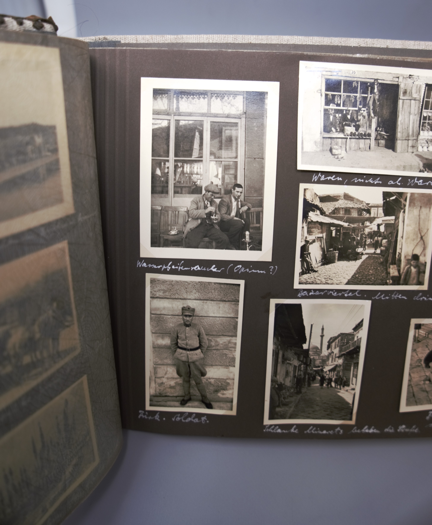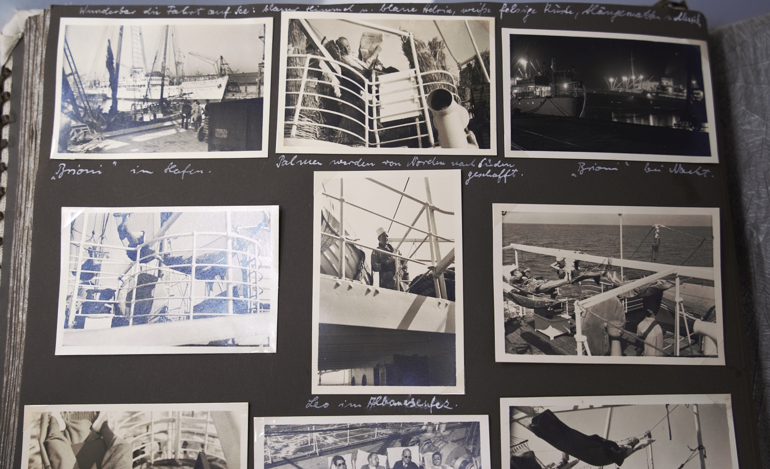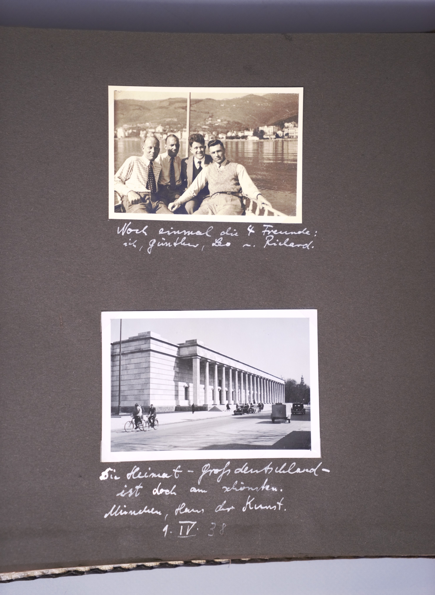 Privates Fotoalbum mit annährend 300 Fotos. Sie schildern eine Reise von vier befreundeten jungen Männern, die vom 4. März bis 1. April 1938 andauerte. Die Vier bereisten die Alpen, wanderten und trieben Wintersport im Ortlergebiet in Südtirol, besuchten Meran und bestiegen in Venedig das Schiff Brioni, das sie nach Triest, Koper, Split und Tirana bis Korfu brachte, unterbrochen von Landausflügen, etwa zu den Adelsberger Grotten. Höhepunkt der Reise war der Besuch von Athen. Weiter ging es nach Smyrna, Patmos, Rhodos, zurück nach Venedig und mit der Bahn über Bozen in "die Heimat - Großdeutschland - [wo es] doch am schönsten [ist] München, Haus der Kunst" (so der Eintrag unter dem letzten Foto). Alle Fotos sind erläutert, genannt sind die Orte, vereinzelt auch die Reiseumstände, Tageszeiten etc. sowie die Namen der gezeigten vier Freunde: Günther Dünweg aus Neumagen, Richard Dahmen aus Mülheim ("Capitano"), Leo Wald, Trier ("Musikwart") und Rolf Harder, Trier ("teilt sich mit Günther in Finanzsachen"). Die Kommentare sind glücklicherweise nicht im aufdringlich spaßigen Stil gehalten, wie es bei Alben dieser Art oft der Fall ist. Einige Fotos zeigen Günthers fotografisches Talent, dem es immer wieder gelingt, nicht nur Schnappschüsse, sondern atmosphärisch dichte Aufnahmen zu produzieren. Die Fotos zeigen das, was man in einem Album dieser Art erwartet: Straßenszenen, Gebäude, Landschaftsaufnahmen, Land und Leute, das Leben an Bord, die antiken Monumente etc. Einige Kommentare sind im Herrenmenschen-Ton gehalten, z. B. "Hauptbeschäftigung der Männer in Tirana: Im Straßendreck herumlungern." Allein über einen einzigen Teilnehmer der Reise, über Günther Dünweg, kann man auf der Website der Gesellschaft für Geschichte des Weines (https://www.geschichte-des-weines.de) Folgendes erfahren: "Weingutsbesitzer und Weinkommissionär. *6. Mai 1912 in Neumagen, † 9. April 1989 ebd. - Entstammt einer alteingesessenen Weingutsfamilie. Weinbaustudium in Geisenheim. Danach Übernahme des elterlichen Weingutes, Weinhandels- und Weinkommissions-Unternehmens. Gründungsmitglied der Weinbruderschaft Mosel-Saar-Ruwer und von 1970−88 deren Bruderschaftsmeister, danach bis zu seinem Tode Ehrenbruderschaftsmeister. 38 Jahre Mitglied des Kreistages Bernkastel und Bernkastel-Wittlich und fast ebensolange Mitglied des Kreisausschusses und des Weinbauausschusses. 1946−84 führte er die Kreistagsfraktion der FDP. Im Heimatort Neumagen war er 1947−80 Vorsitzender des Sportvereins. 1986 Ernennung zum Ökonomierat und Auszeichnung mit dem Bundesverdienstkreuz, der Freiherr-vom-Stein-Plakette und der Theodor-Heuss-Medaille. Er hat sich um den Weinbau von Mosel-Saar-Ruwer sehr verdient gemacht, wobei er besonders die weinrechtlichen Entwicklungen mitgestaltet hat. Dabei ist er für die Rebsorte Riesling und ihre weinrechtliche Stellung, Bezeichnung und Spezialität in besonderem Maße eingetreten. Aber auch der Erhalt und die Förderung der Familienbetriebe im Weinbaugebiet und damit die Zukunft der Weinlandschaft waren ihm ein großes Anliegen." Das Album bekommt auch durch die Tatsache, dass eineinhalb Jahre später wohl alle vier Reiseburschen in welcher Funktion auch immer in Hitlers Malstrom des Todes gerieten, eine besondere Wirkung. - Die beiden gekreuzt montierten Stoffbänder auf dem Vorderdeckel tragen die Aufschriften "Marco Polo" und "Filippo Rimani". – Sehr gut erhalten.