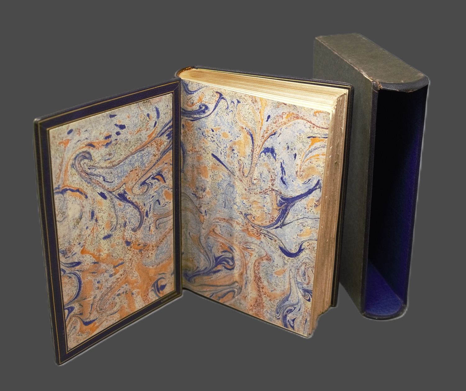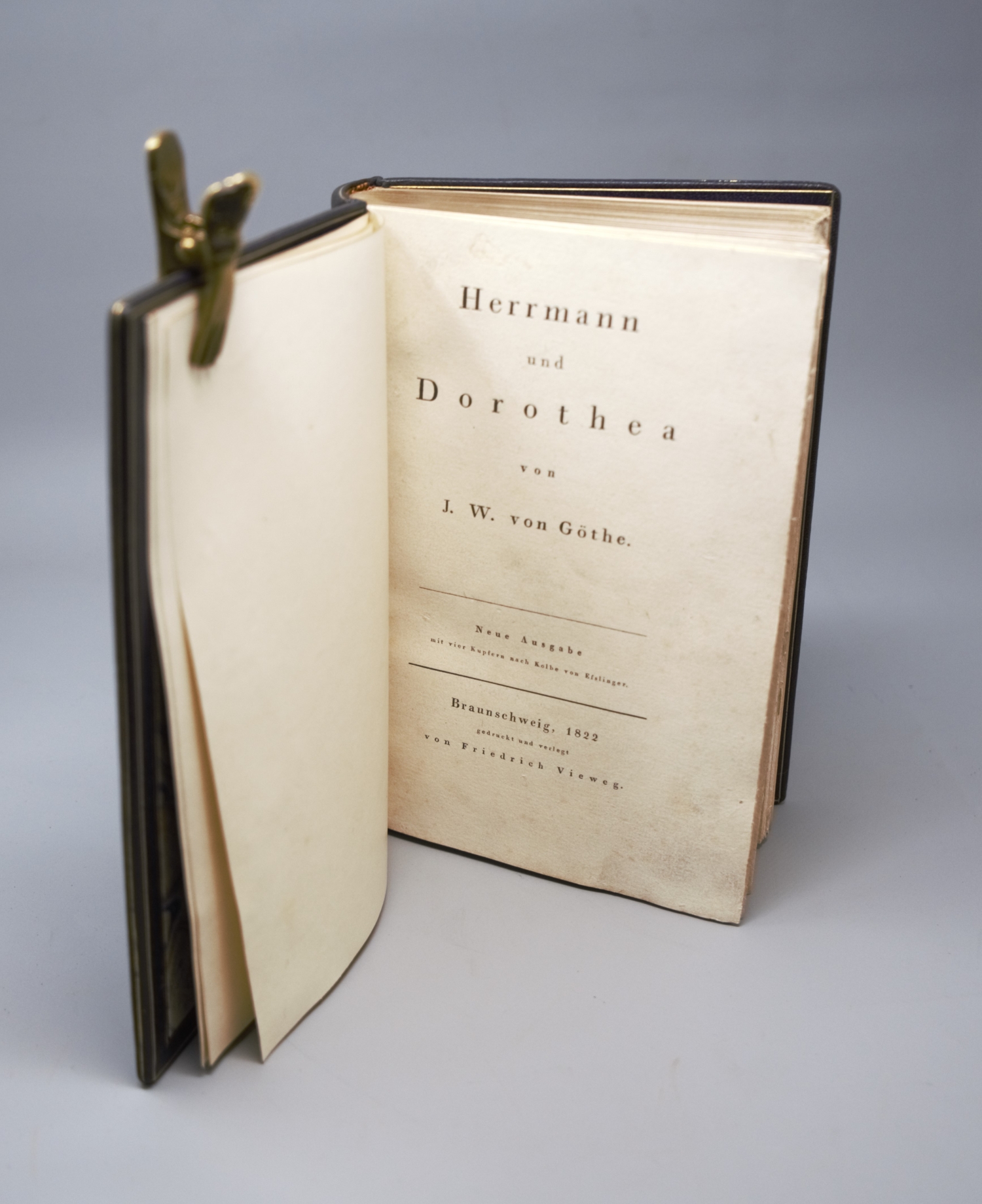 Goethe, J(ohann) W(olfgang) von. Herrmann und Dorothea. Neue Ausgabe. 1 Bl., 239 S. Mit 4 Kupfertafeln von Esslinger nach Kolbe. 23 x 15 cm. Dunkelblauer moderner Lederband (sign.: K. Ebert München; Vorder- und Rückdeckel mit geringer Verfärbung) auf 5 unechten Bünden mit goldgeprägtem RTitell, mehrfacher Filetenvergoldung und KGoldschnitt. In Pappschuber mit Ledersaum. Braunschweig, Friedrich Vieweg, 1822.