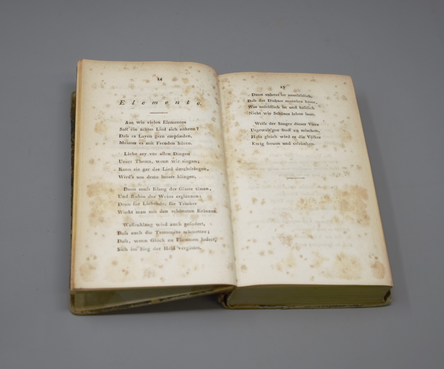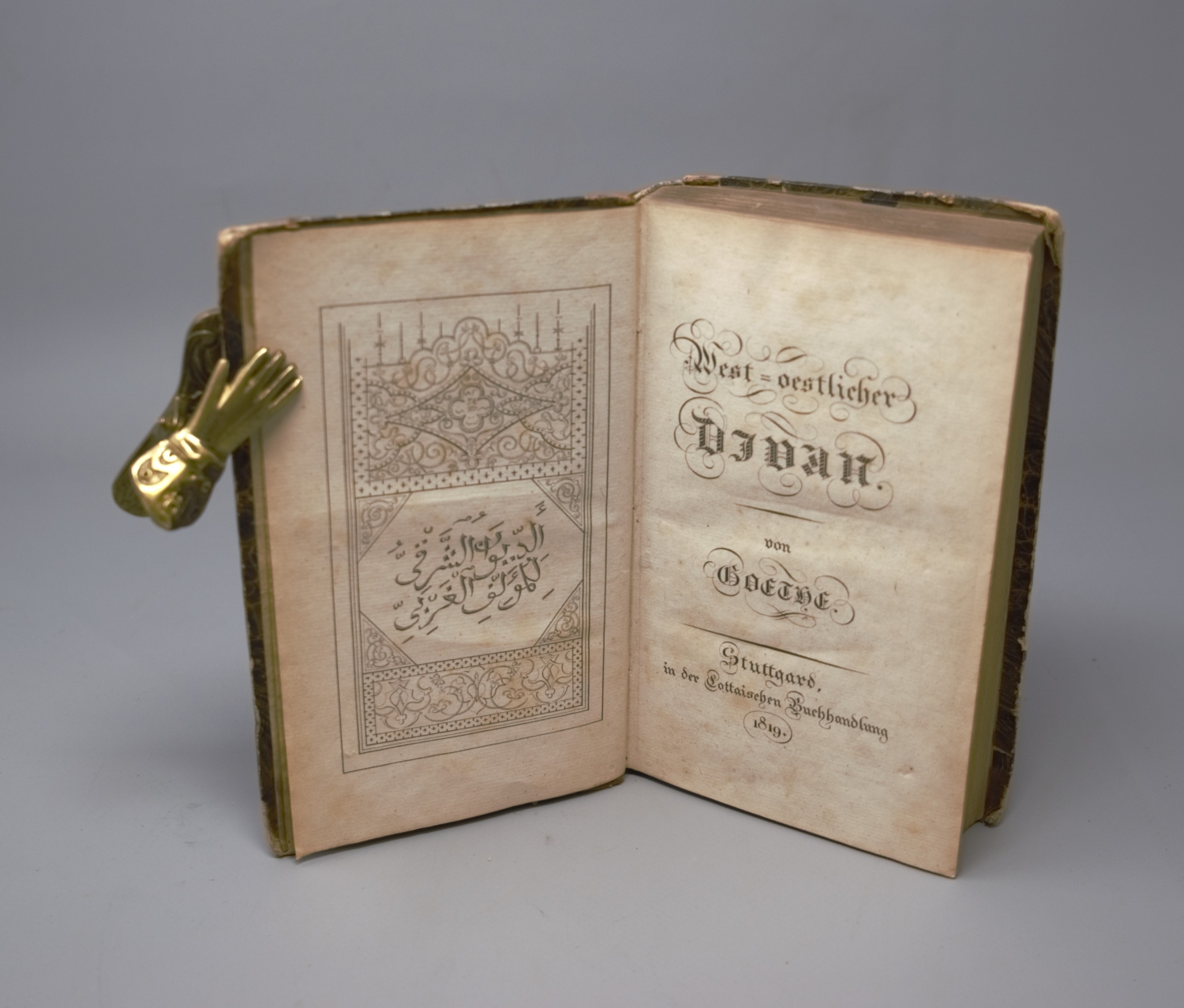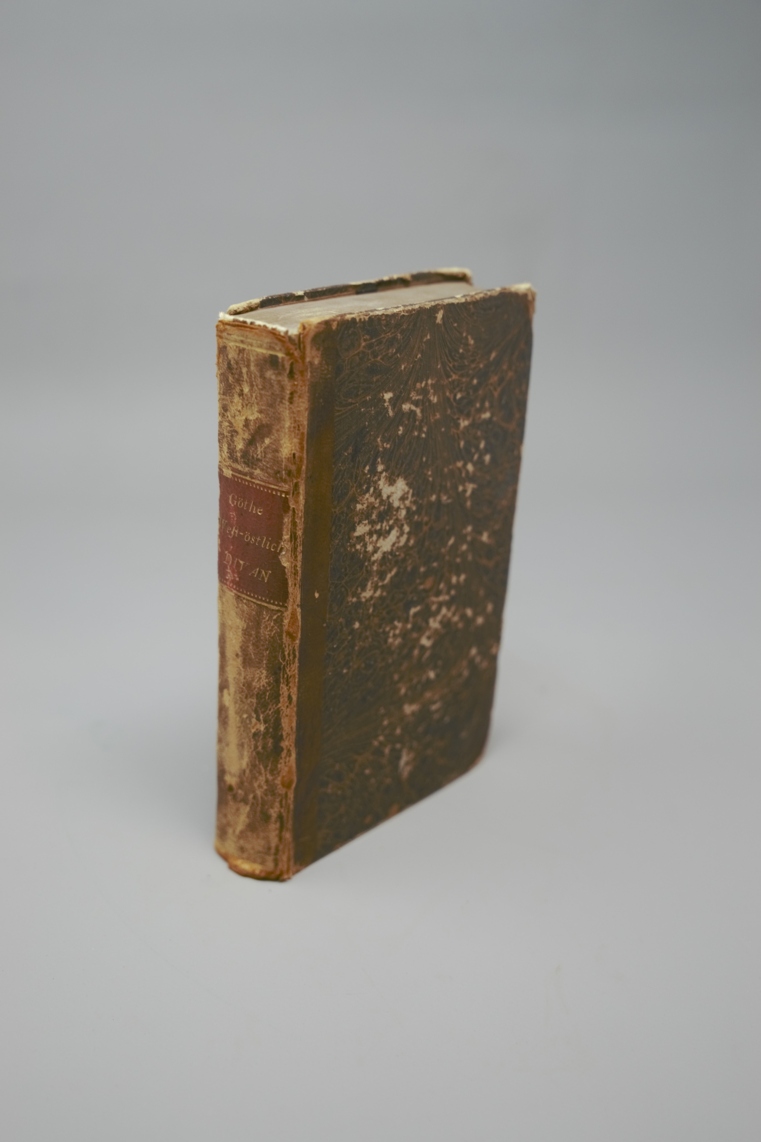 Goethe, (Johann Wolfgang von). West-oestlicher Divan. 556 (recte: 554) S. Mit Kupfertitel und gestochenem Frontispiz. 17,5 x 10,5 cm. Halbleder d. Z. (stärker berieben und beschabt, oberes Kapital defekt) mit RVergoldung und goldgeprägtem RSchild. Stuttgart, Johann Georg Cotta, 1819.