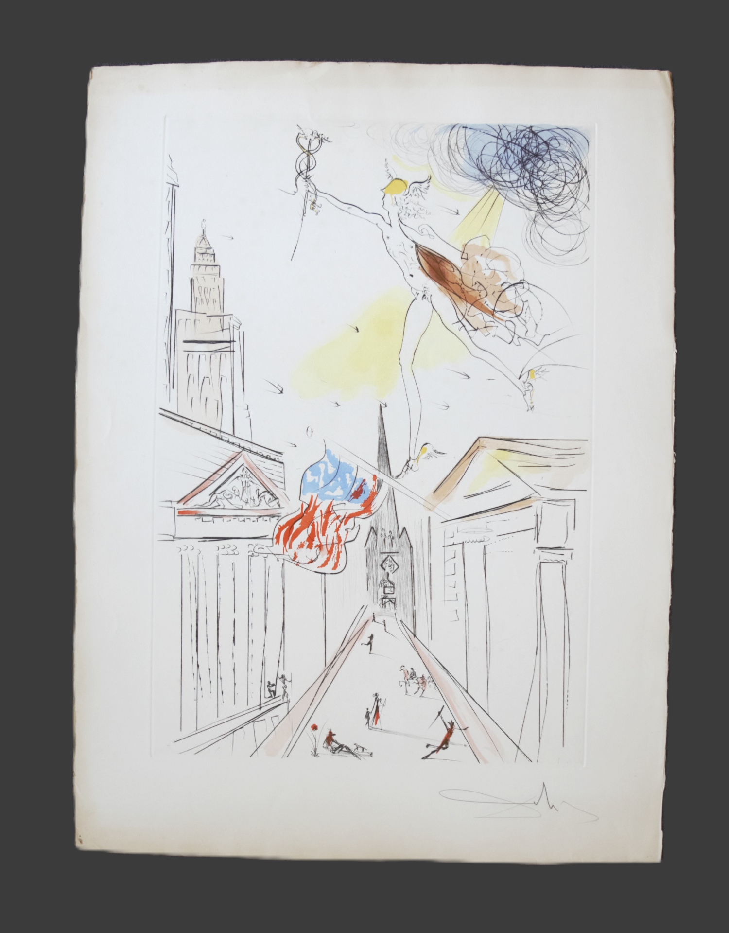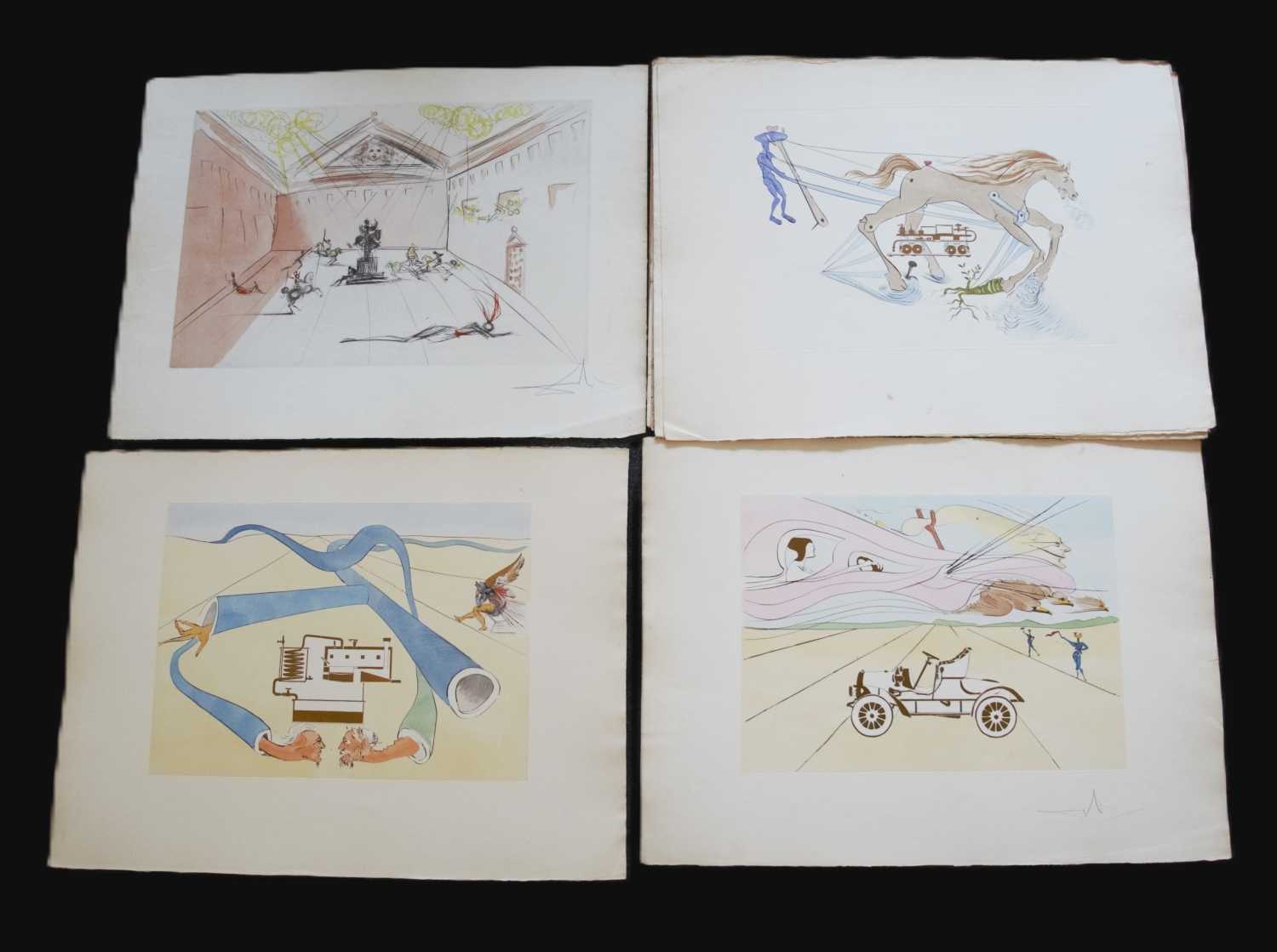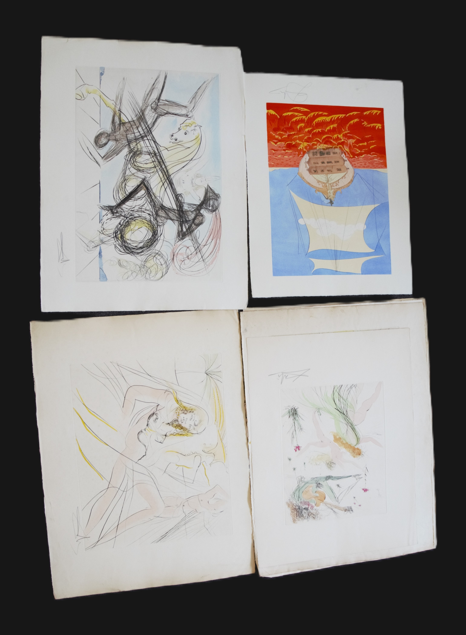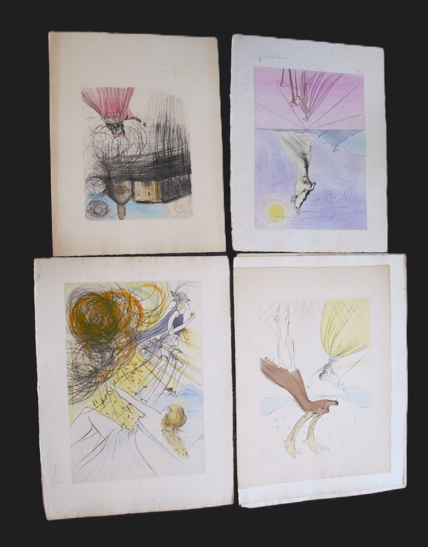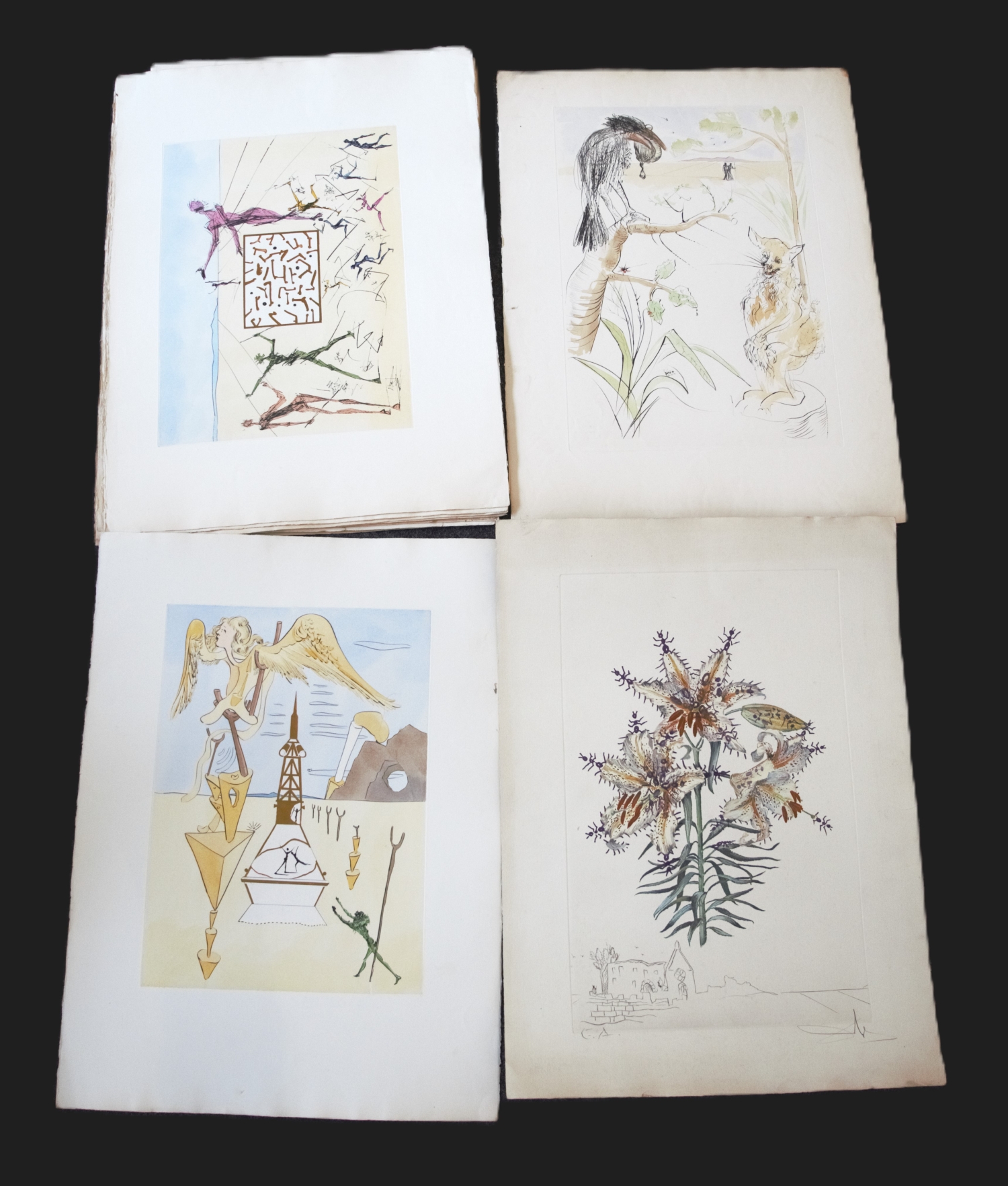 Die Graphiken zeigen unterschiedliche abstrakte Szenerien in kräftigen Farben, teilweise mit bekannten Motiven, wie der zerlaufenden Uhr oder der  Erzengel Michael. – Vereinzelt mit kleineren Fehlstellen am Rand, Randläsionen und kleinen Gebrauchsspuren. Alle signiert, jedoch teilweise nicht vom Künstler.