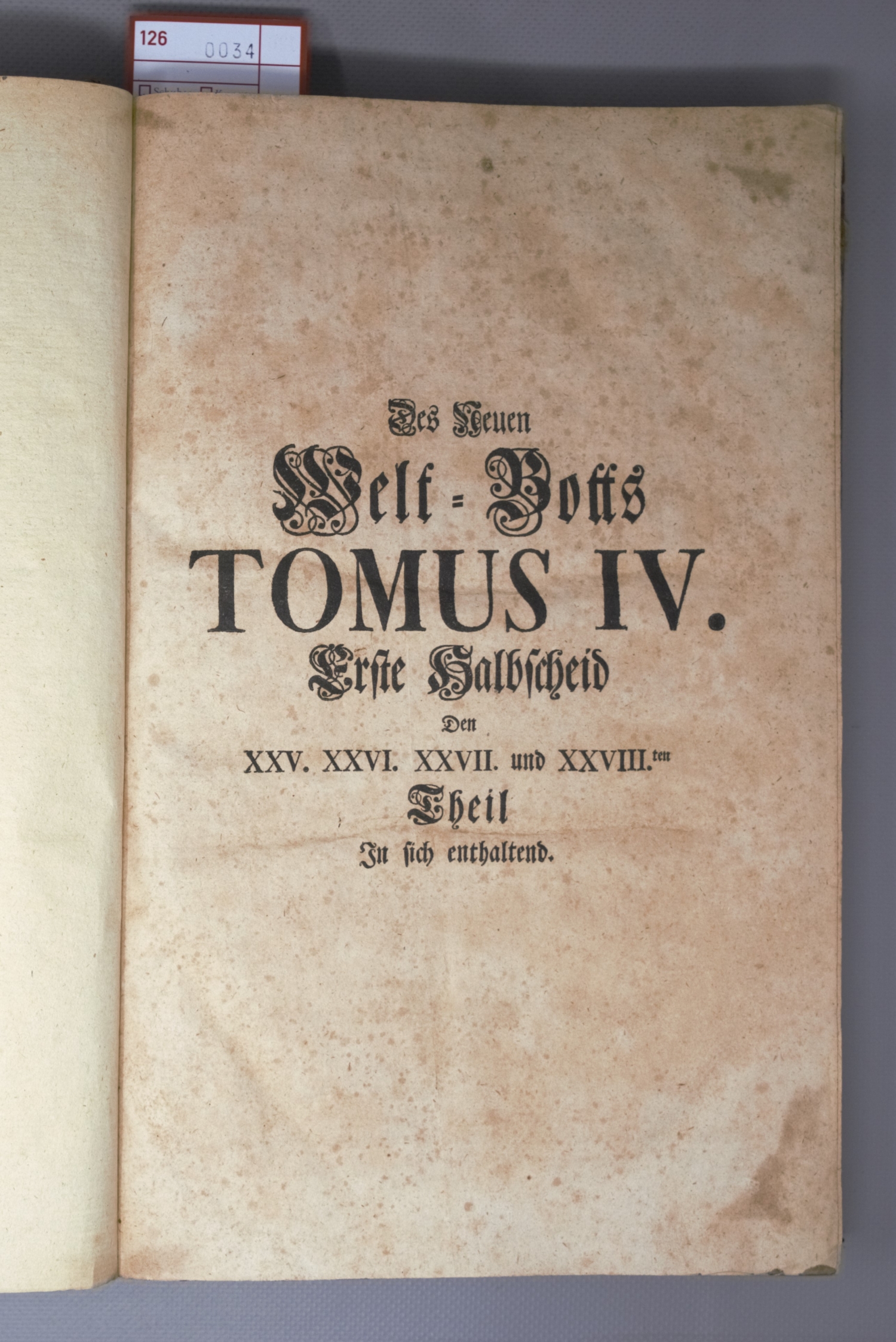 Der neue Welt-Bott Tomus IV. Streit I, 838. De Backer-Sommervogel VII, 1586. Sabin 91981. Palau 322.590. Cordier, BS 941f. – In sich geschlossener Band IV der von 1726 bis 1761 in insgesamt 38 Teilen erschienenen und von Josef Stöcklein herausgegebenen Sammlung von Berichten über Reisen und Missionsgründungen der Jesuiten in Amerika, Asien und Afrika, auch als "Welt-Bott" bekannt, zugleich eine der bedeutendsten Quelle der Missionsgeschichte des 18. Jahrhunderts. "Der Wert dieser Sammlung besteht darin, daß Stöcklein eine große Anzahl von Briefen veröffentlicht, die von deutschen Missionaren stammen" (Streit). Die drei Faltkarten zeigen die Philippinen, Paraguay und Afrika. – Etwas braunfleckig, sonst wohlerhalten.