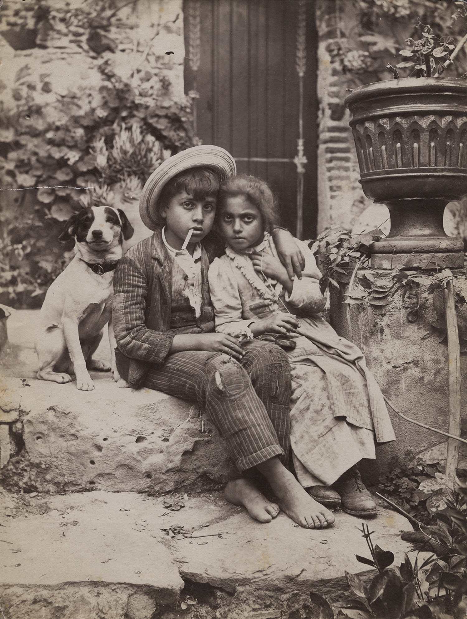 Sicilian children with dog. 1904. Albumen print. 22,4 x 17 cm. Photographer's "V. Von Gloeden / Taormina-Italia-Sicilia / Proprietà Artistica dell’Autore” studio stamp, therein dated “25 FEB 1904” in purple ink and handwritten inventory number “2145” in blue crayon on the verso.