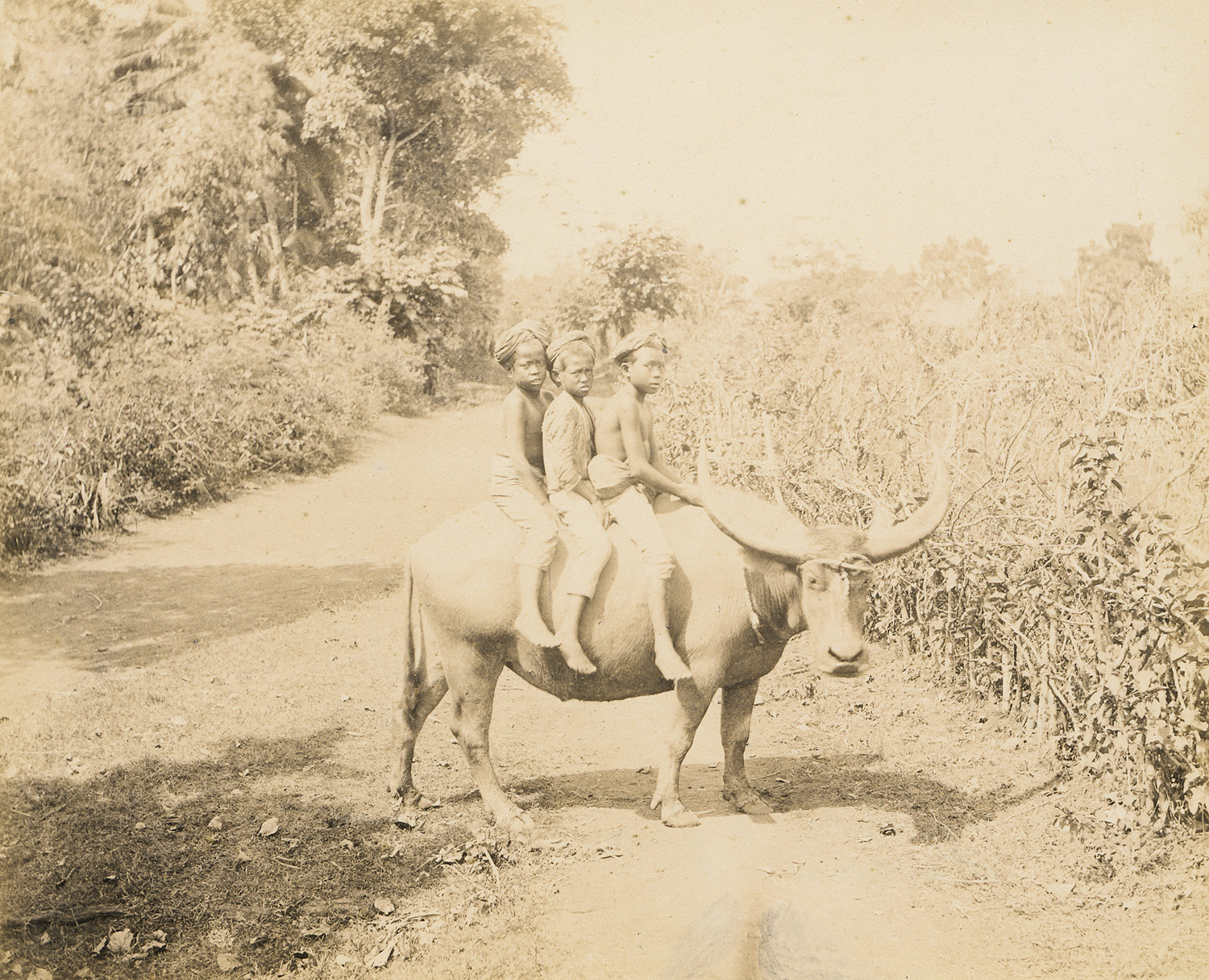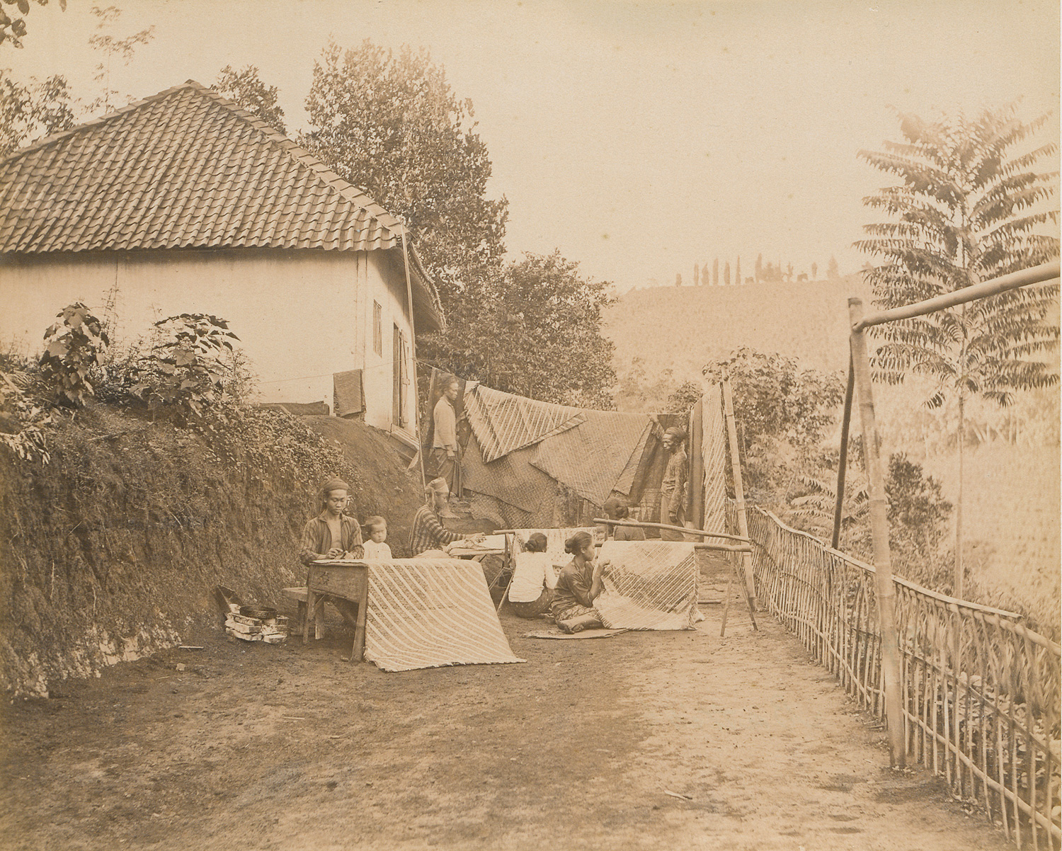 Photographer: Woodbury & Page (active 1857-1908). Views of Java. 1870s. 30 albumen prints, mounted to boards. Each ca. 19 x 24 cm or reverse (34,5 x 46 cm). With the photographer’s blind stamp embossed in lower right corner and handwritten captions in pencil below the images on the mount. Presented in canvas-backed clamshell box with silk-lined interior and richly hand-illustrated title leaf featuring Javanese script and a dedication to “Fürst Bismarck.”