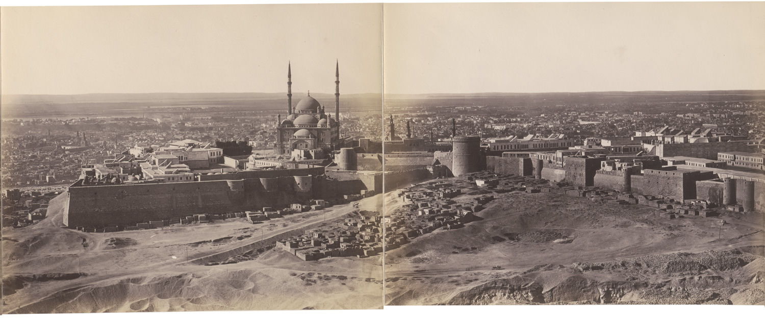 This six-part panorama of Cairo, attributed to Pascal Sébah, depicts a sweeping view of the city’s historical and architectural landmarks, including such sites as the Muhammad Ali Mosque, the Cairo Citadel, the aqueduct, the northern cemetery, and the mosques of Sultan Hassan and al-Rifa’i among others.  – Boards slightly toned, folder slightly soiled and with some spots, some fading at folds of prints, otherwise in very good condition.