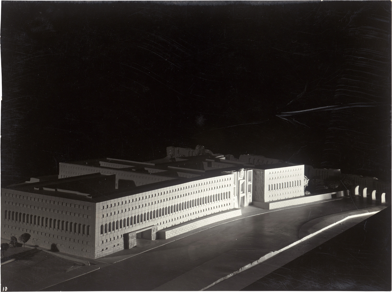 These photographs document architectural models created as part of Fascist-era plans to reshape Rome during the 1930s. According to inscriptions on the mounts, the models represent a proposed but unrealized ministry building situated near the Aurelian Wall. While this specific project was not executed, the images reflect broader ambitions of Benito Mussolini’s regime to impose monumental buildings on the fabric of ancient Rome - a process that often entailed large-scale demolitions and controversial interventions in the city’s historic landscape. – Some oxidation mirroring in edges, otherwise in good condition.