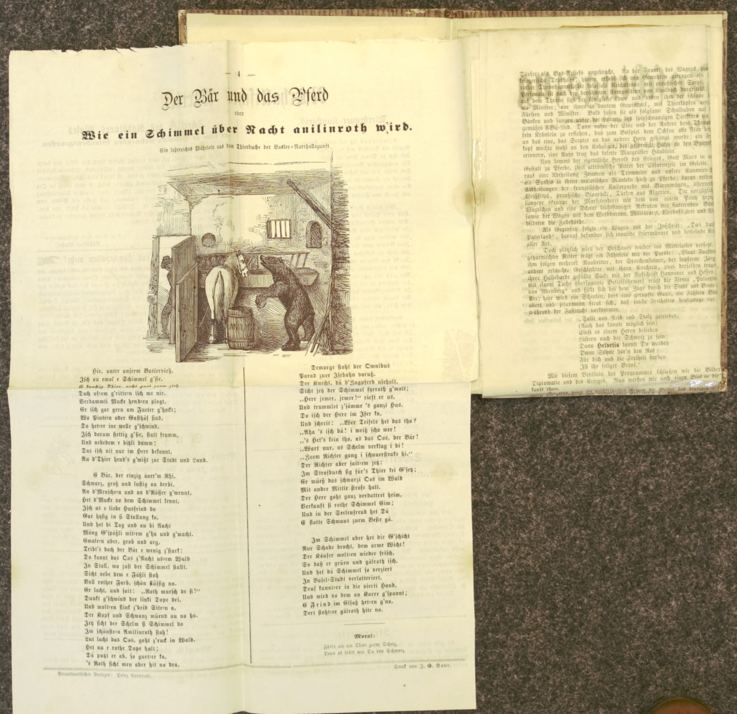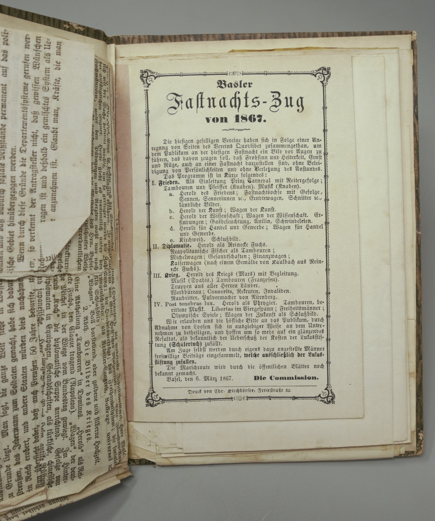 Kuriose Sammlung von Zeitungsausschnitten, Lotterielosen, Programmheften, Liedtexten, Reden, Gedichten und Holzschnitt-Tafeln als Andenken an die Baseler Fastnacht im 19. Jahrhundert. Die Holzschnitttafeln zeigen den Fastnachtszug mit zahlreichen Kostümierten und Musikanten unter dem Titel "Fastnachtszug 1867. Die Gegensätze unserer Zeit oder Krieg & Frieden". – Papierbedingt gebräunt, vereinzelt leicht stockfleckig und knickspurig, teils mit Randläsuren sowie hinterlegten Fehlstellen.