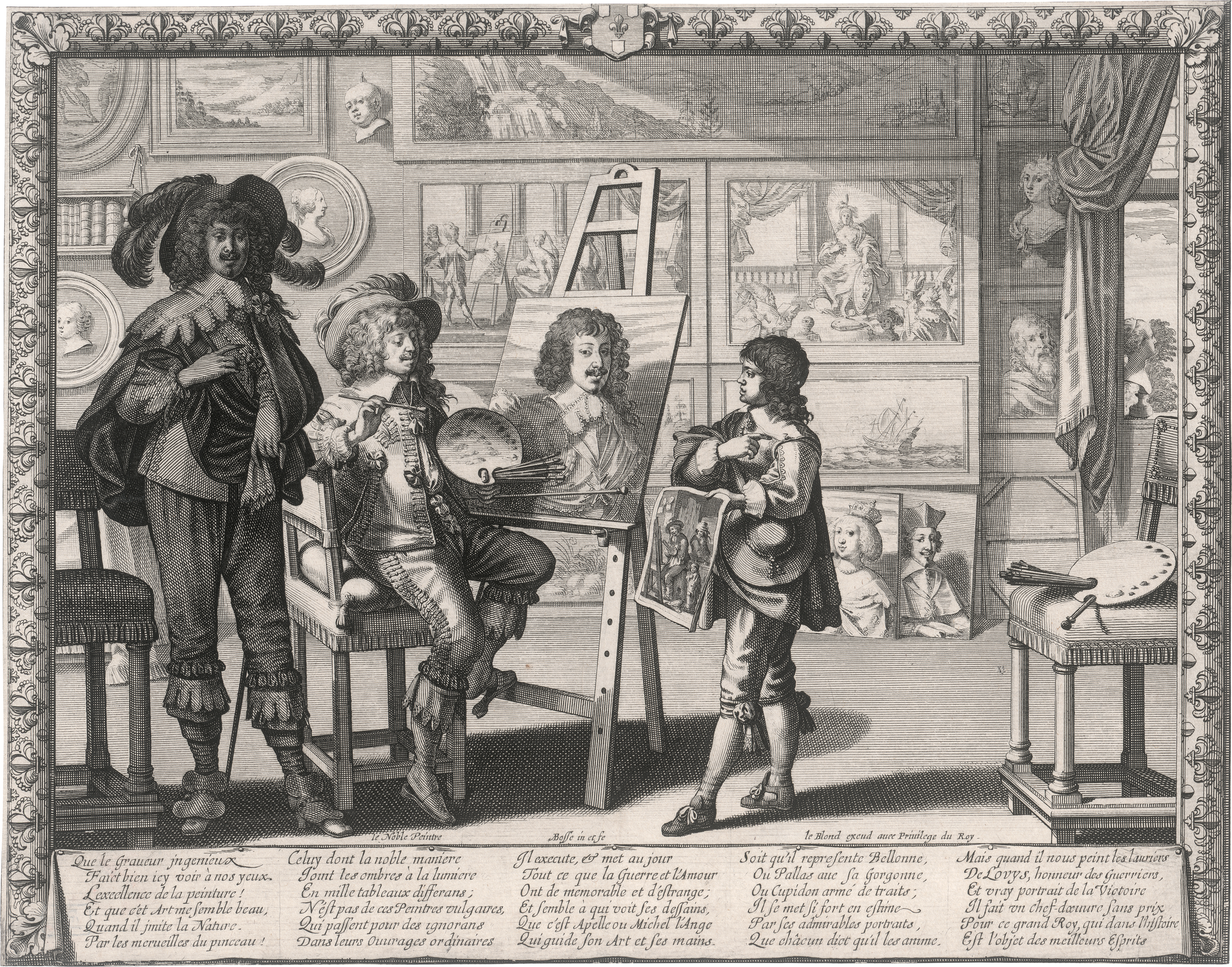 Der Maler in seinem Atelier - Le noble peintre. Kupferstich und Radierung. 25,3  x 32,5 cm. (1642). Duplessis 1385, Blum 1076 II, Ausst. Kat. French Prints from the Age of the Musketeers, Boston 1998, Nr. 7 mit Abb.