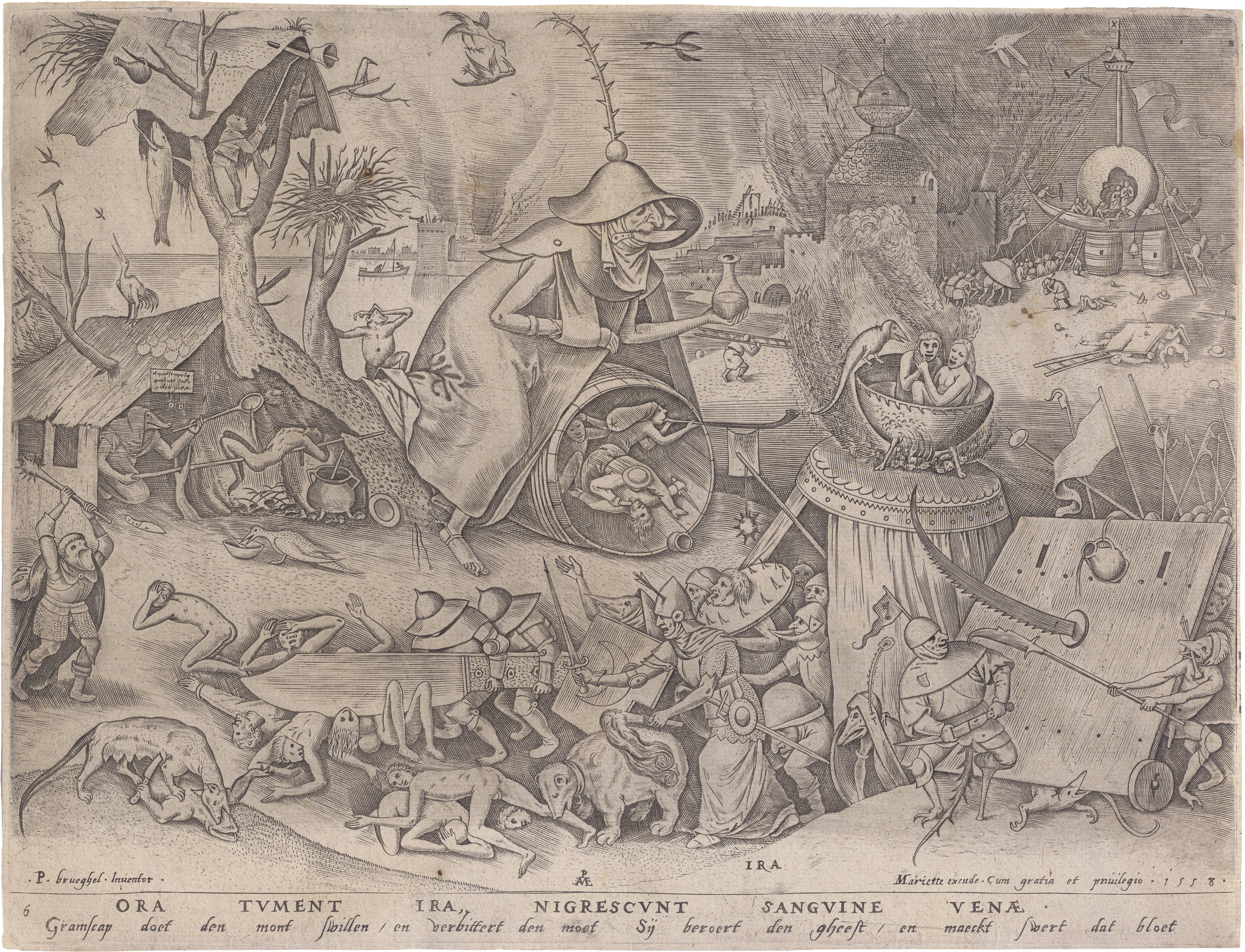 nach. Ira. Kupferstich von Pieter van der Heyden, aus der Folge der Sieben Todsünden, wie die folgenden vier Losnummern. 22,1 x 29,2 cm. 1558. Hollstein (Bruegel) 125, Hollstein (Cock) 236, Bastelaer 125, Riggs 39, Orenstein (New Hollstein) 21, Bassens/Grieken 11 a. Wz. Krug mit Deckel, Buchstabe, Blume und Fleur-de-lis.
