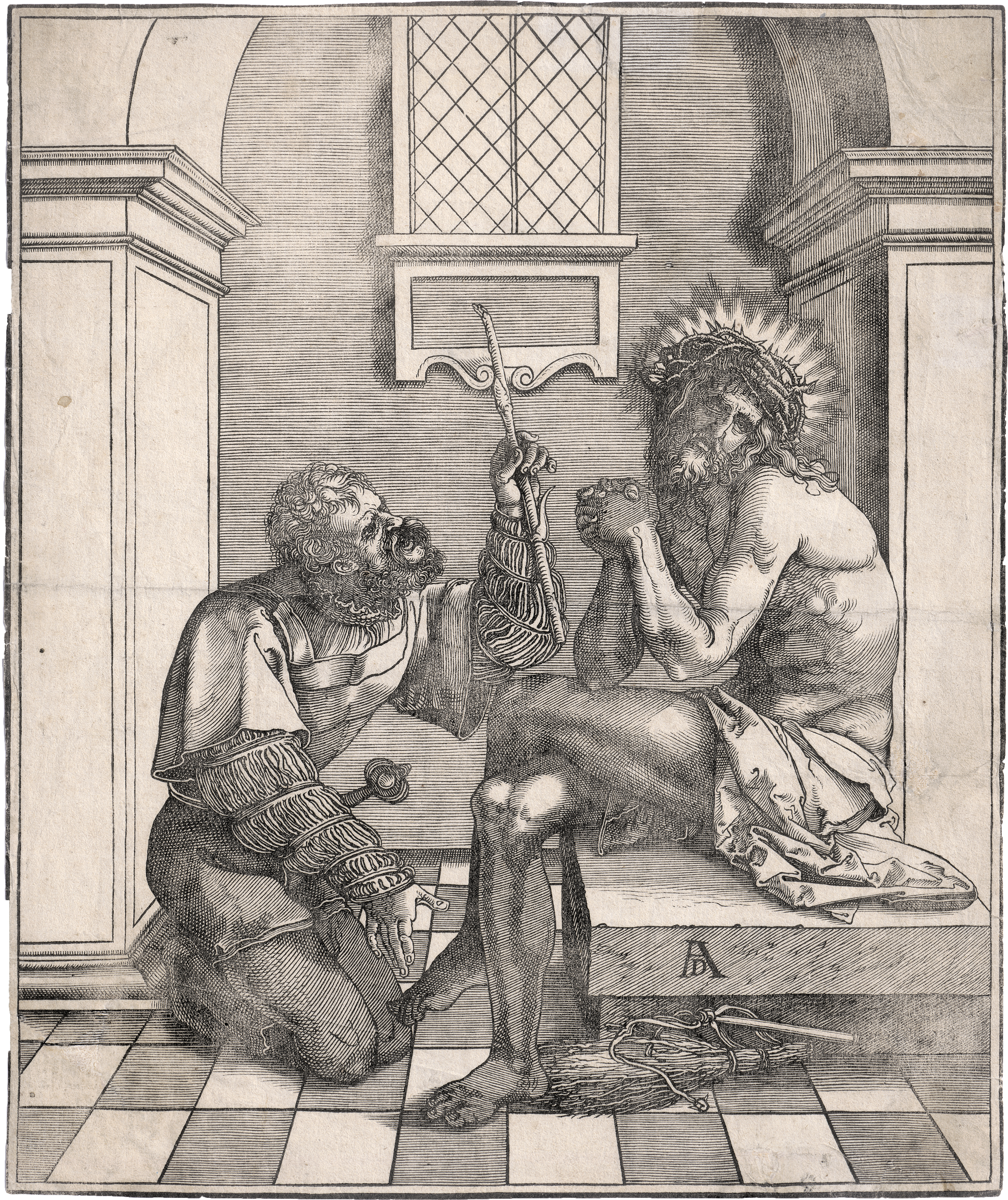 Vorliegender Holzschnitt entstand nach Dürers Titelblatt zur Großen Holzschnittpassion (Meder 113). Dürer verschmolz in der für die Folge programmatischen Darstellung die Szene aus der Passion, in der einer der Schergen Jesus zum Hohn einen Zweig als Zepter überreicht, mit dem in der Kunst zur Dürerzeit verbreiteten Bildtypus Jesus in der Rast, der den Schmerzensmann sitzend mit seinen Leidenswerkzeugen zeigte. Christus schaut mit gefalteten Händen aus dem Bilde. Während Dürer die Szene mit einer Wolkengloriole umgab, hat unser Künstler sie in einen Innenraum mit einer Bogenarchitektur und getäfeltem Fußboden gesetzt. In den Figuren folgt der Künstler Dürer detailgetreu, auffällig ist jedoch das Fehlen der Wundmale Christi an Hand und Füßen sowie die Anbringung des Dürer-Monogramms auf dem Stein unten. Heller und Strauss bezeichneten den Innenraum als Gefängnis, doch könnte es sich auch um eine kirchliche Umgebung handeln. Die Schnitttechnik ist höchst verfeinert und präzise, und lässt auf einen versierten Holzschneider schließen.