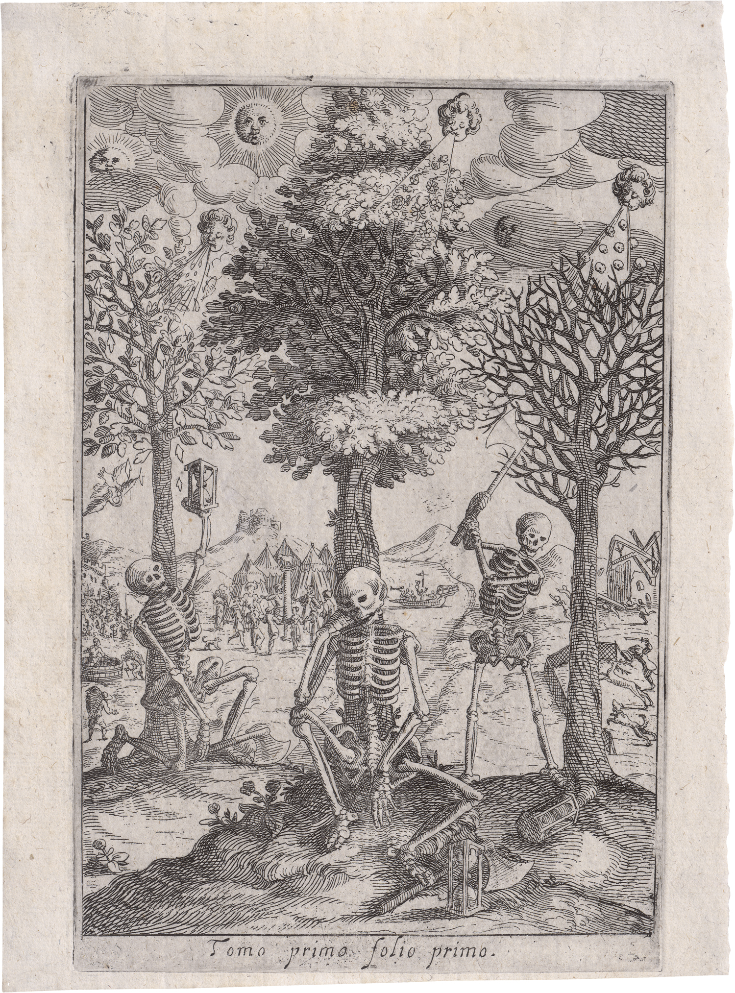 um 1560. Allegorie des Todes (Drei Skelette in einer Landschaft mit Äxten und Sanduhren als Attribute). Radierung. 17,8 x 11,7 cm. Wohl unbeschreiben. Wz. Krüglein.