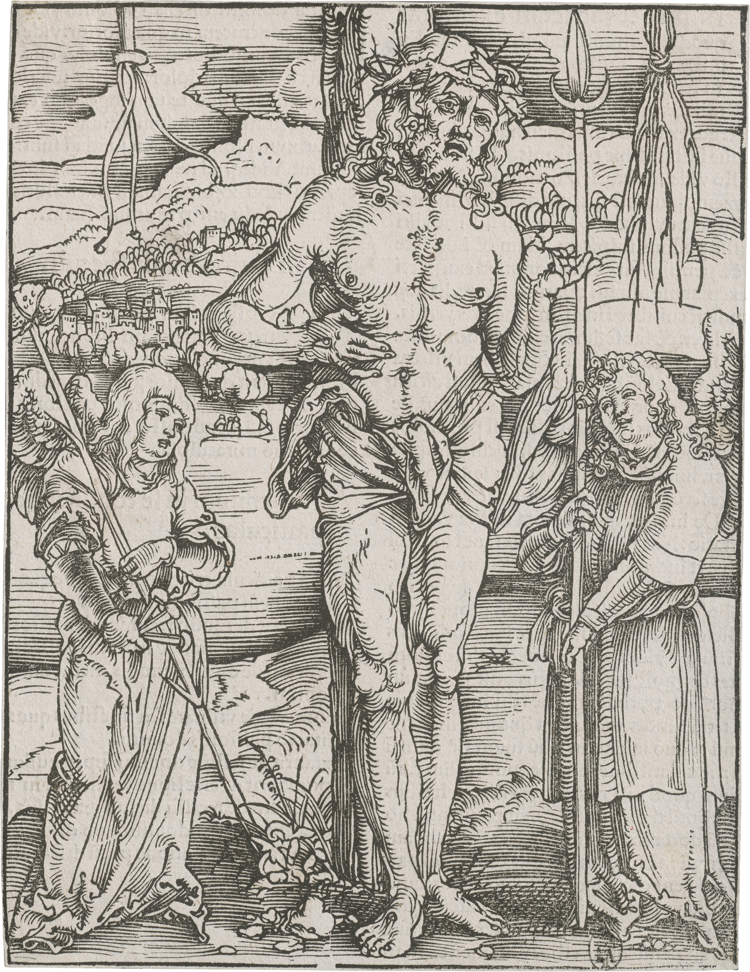 und Hans Baldung Grien (1476 Weyersheim bei Straßburg - 1545 Straßburg). Vier Blatt aus der Passion: Schmerzensmann; Christus vor Kaiphas; Christus am Kreuz; Kreuzigung. 4 Holzschnitte, einer alt koloriert, einer teils koloriert. Je ca. 23,6 x 15,9 cm. Um 1507. B. 34, 9, drei nicht bei Bartsch, Hollstein (Baldung) 212, Hollstein (Schäufelein) 718, eines ohne Nummer bei Hollstein (NB), Hollstein (Baldung) S. 128.