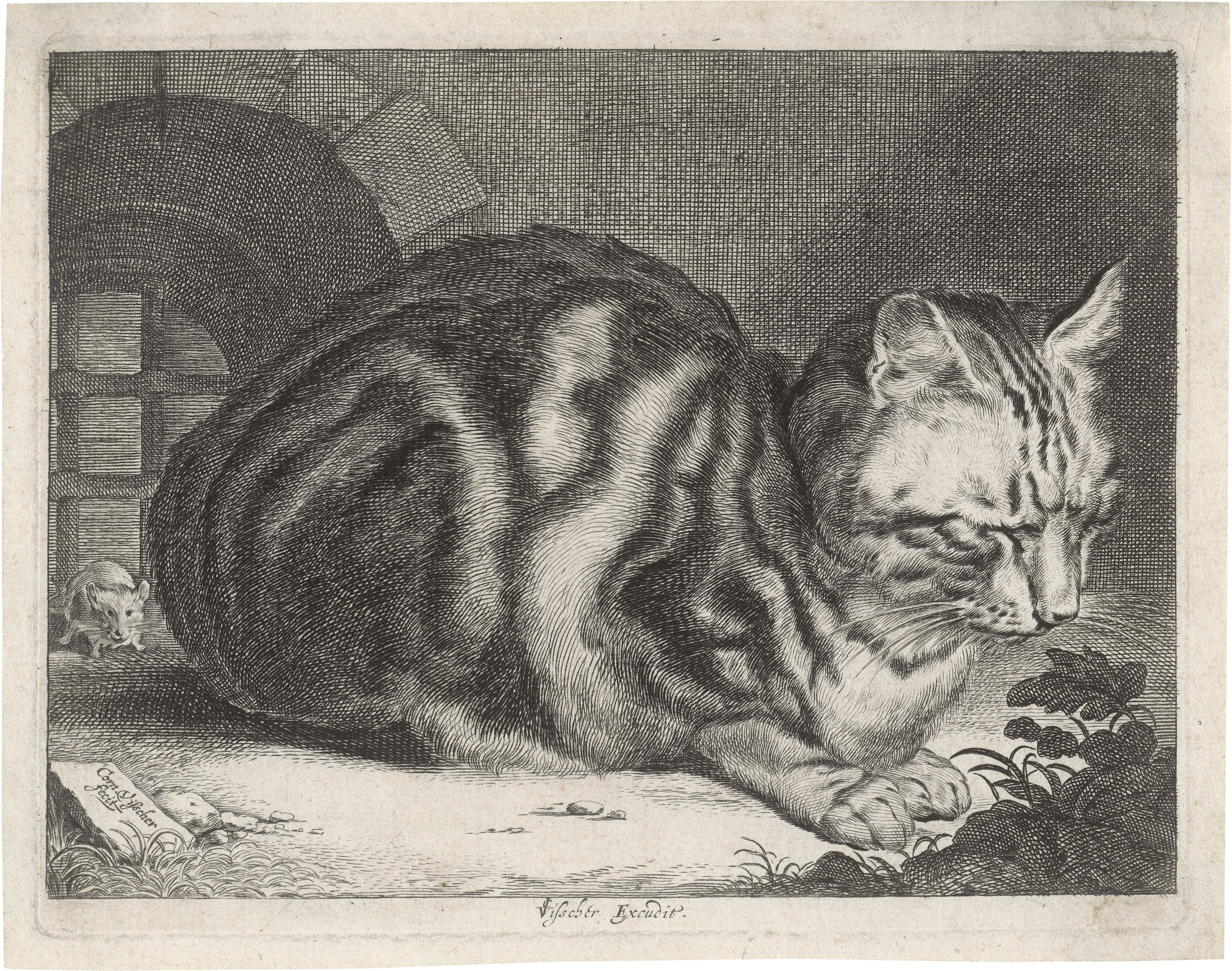 Die große Katze, mit einer Maus zur Linken. Kupferstich. 14,4 x 18,5 cm. Um 1657. Hollstein 42 II.