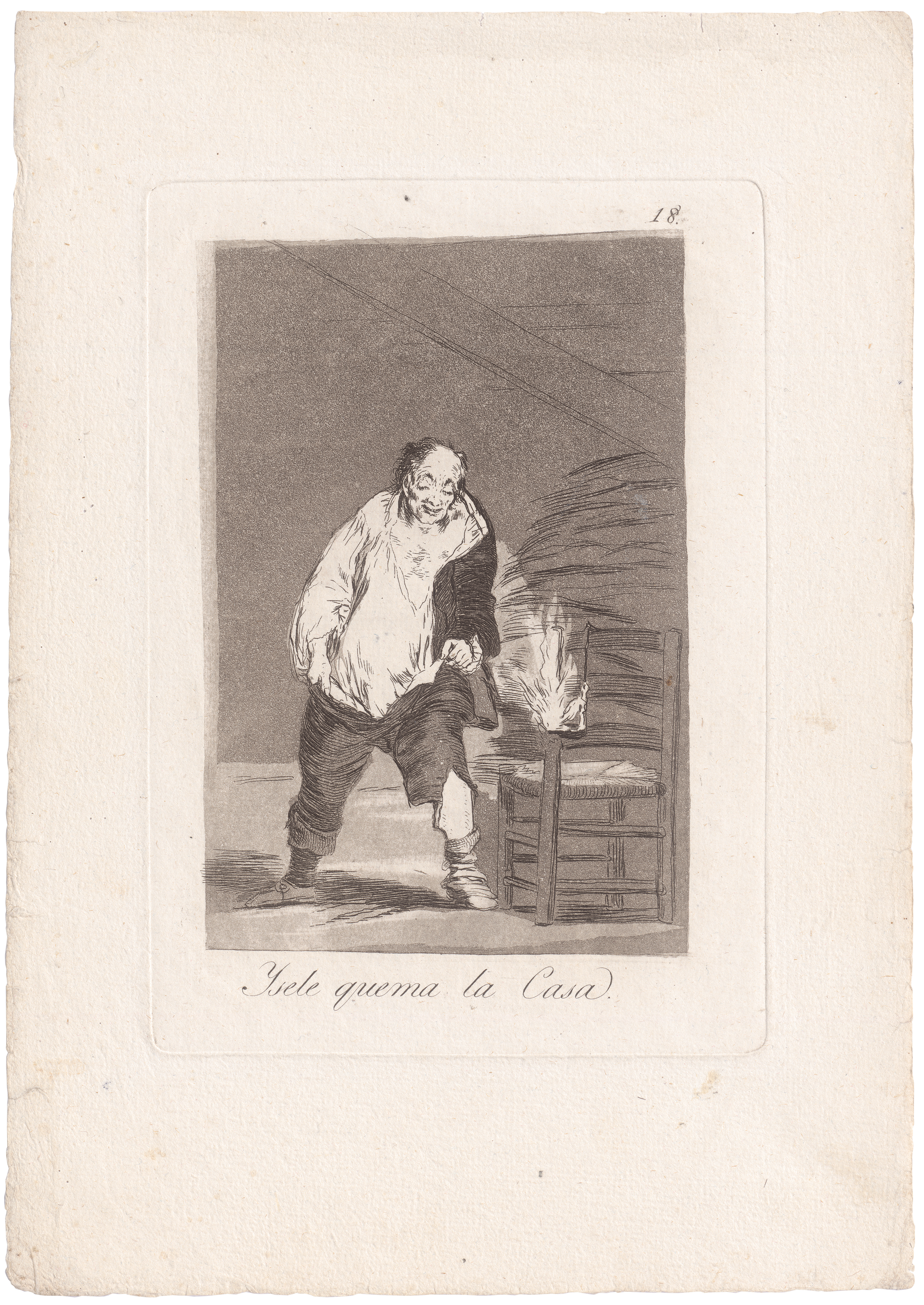 Ysele quema la casa. Radierung und Aquatinta auf Bütten. 21,4 x 15,1 cm (Plattenrand); 31,6 x 22,3 cm (Blattgröße). (1799). Delteil 55, Harris 53 III, 1. Ausgabe (von 12).