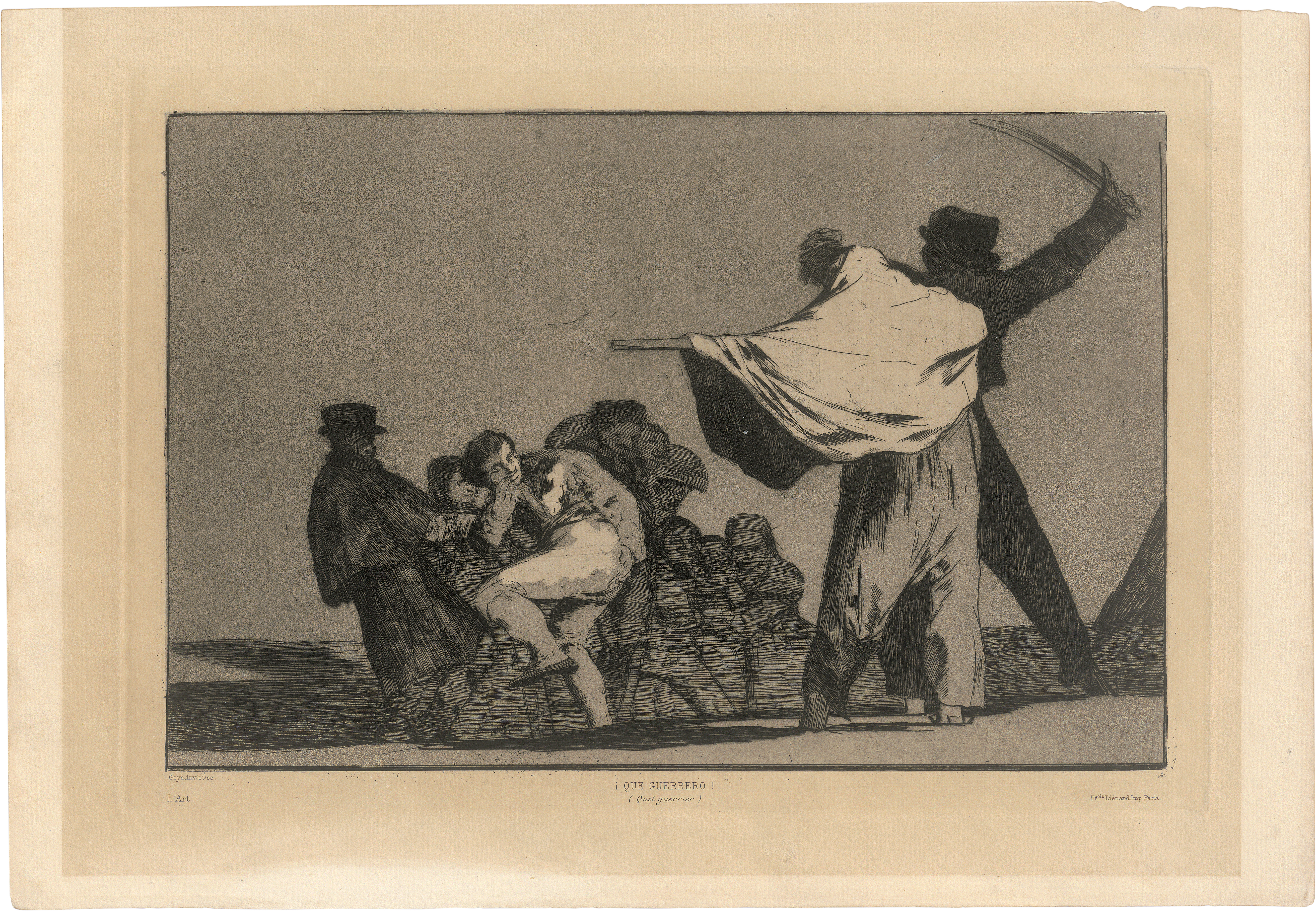 Disparate Conocido (Que Guerrero!). Radierung mit Aquatinta auf Bütten. 24,2 x 35,6 cm (Plattenrand); 29,6 x 42,7 (Blattgröße). Delteil 220 II, Harris 266 III.