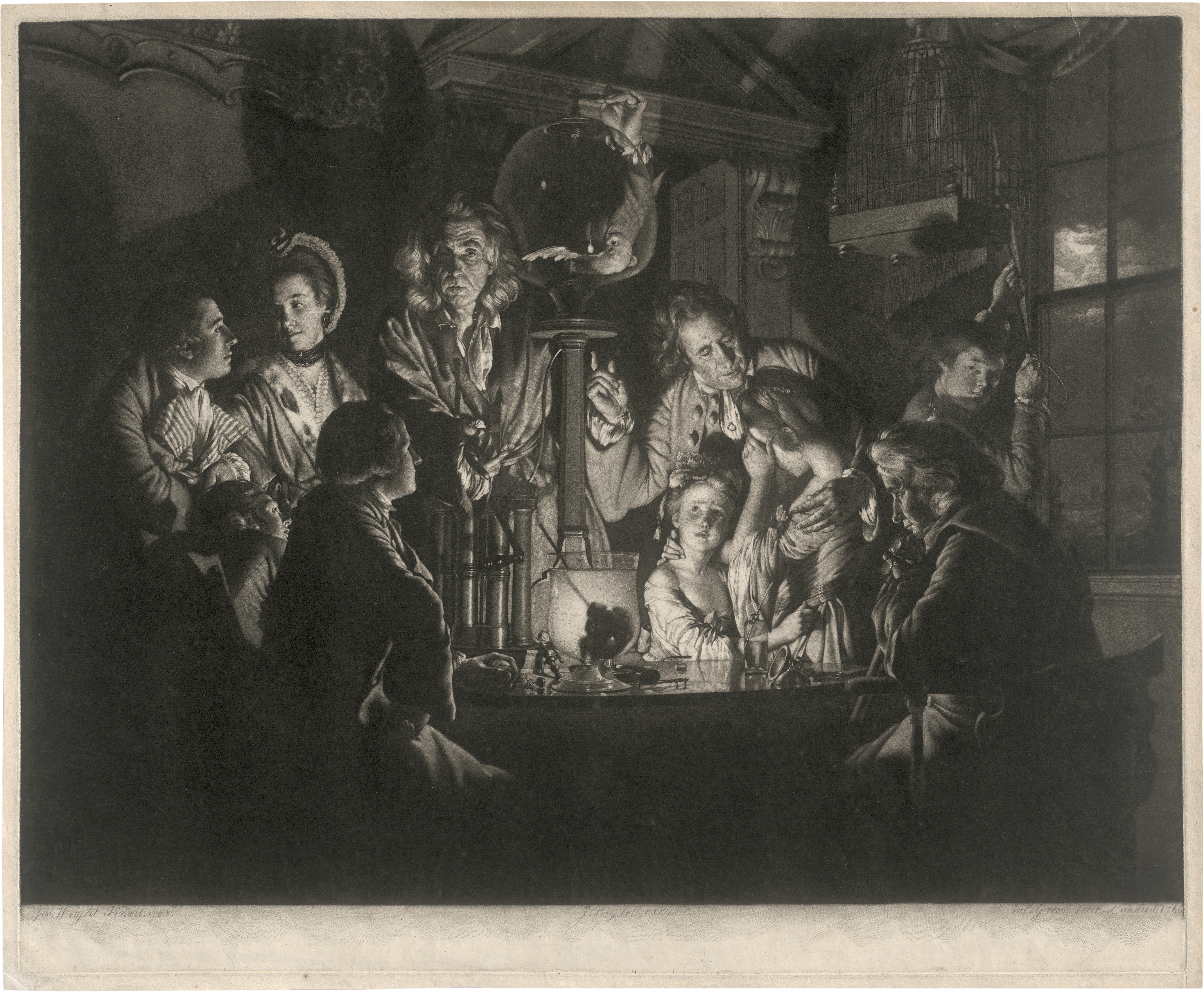 Valentine Greens virtuoses Blatt zählt zu den Höhepunkten der Schabkunst. Es entstand ein Jahr nachdem Joseph Richard Wright of Derby mit dem "Experiment mit der Luftpumpe" eines seiner berühmtesten Kerzenbilder und gleichsam eine Ikone des Illuminismus schuf (1768, National Gallery, London). Die nächtliche Szene zeigt einen Naturphilosophen, also einen Vorläufer moderner Wissenschaftler, der mittels einer Luftpumpe und eines eingeschlossenen Vogels dem gebannten Publikum die Wirkung eines Vakuums demonstriert. Das Motiv liegt hier in einem seltenen Probedruck mit den eingeritzten Namen von Wright, Boydell und Green, jedoch vor Vollendung der Schrift vor. - Prachtvoller, das Helldunkel herrlich plastisch zur Wirkung bringender Abzug mit schmalem Rändchen. Minimal angestaubt und berieben, einzelne Stockflecken, die weiße Eckenspitze unten links ergänzt, zwei Randeinrisse oben, einer minimal knapp in die Darstellung reichend und hinterlegt, verso ein bräunlicher, recto nicht sichtbarer Fleck, sonst in sehr schöner Erhaltung.