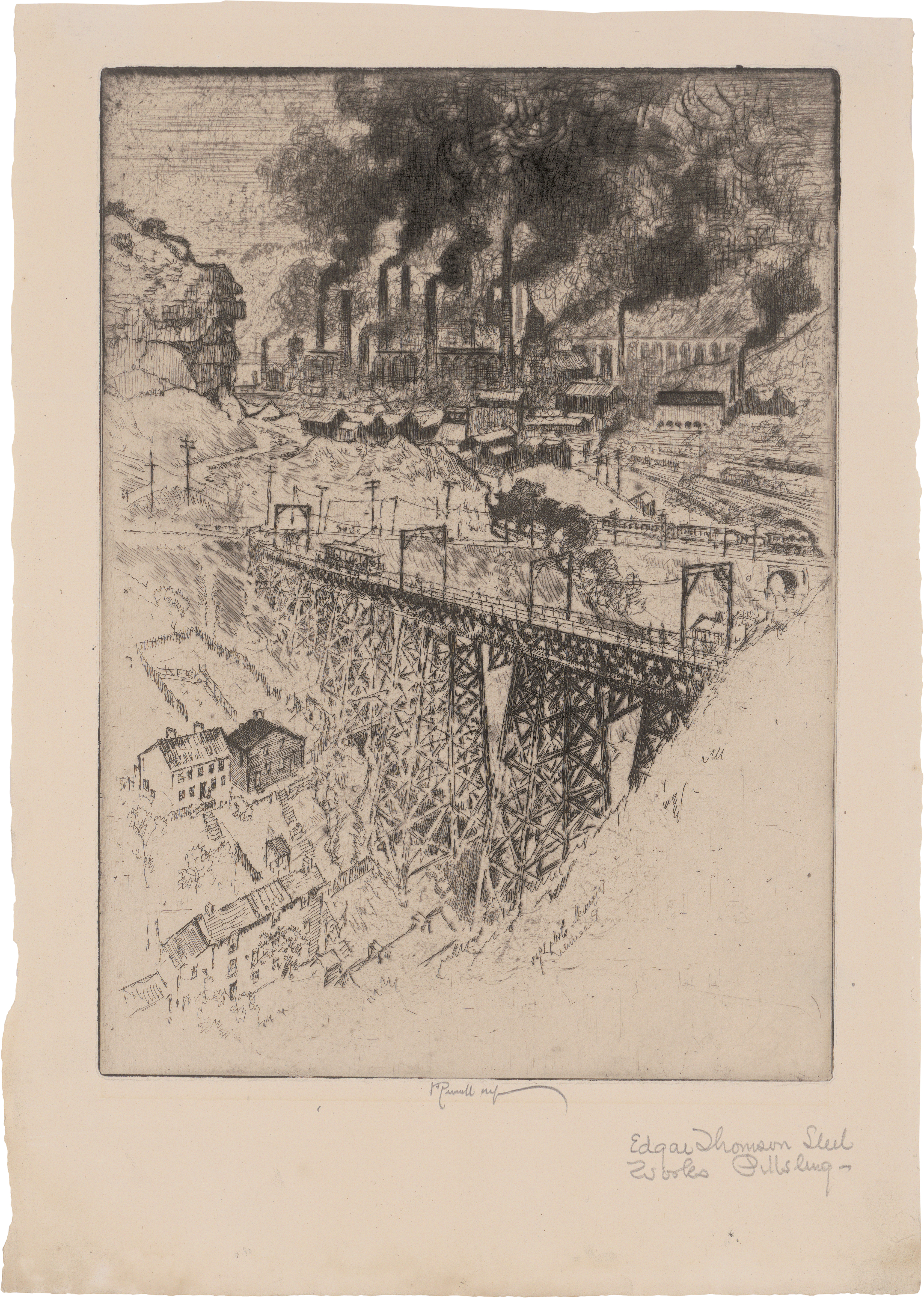 Edgar Thomson Works, Bessemer. Radierung und Kaltnadel auf Bütten. 28 x 20,3 cm. Unterhalb der Darstellung signiert sowie in Bleistift von fremder Hand betitelt "Edgar Thomson Steel Works Pittsburg". Auflage wohl 90 Ex. (1909). Wuerth 517.