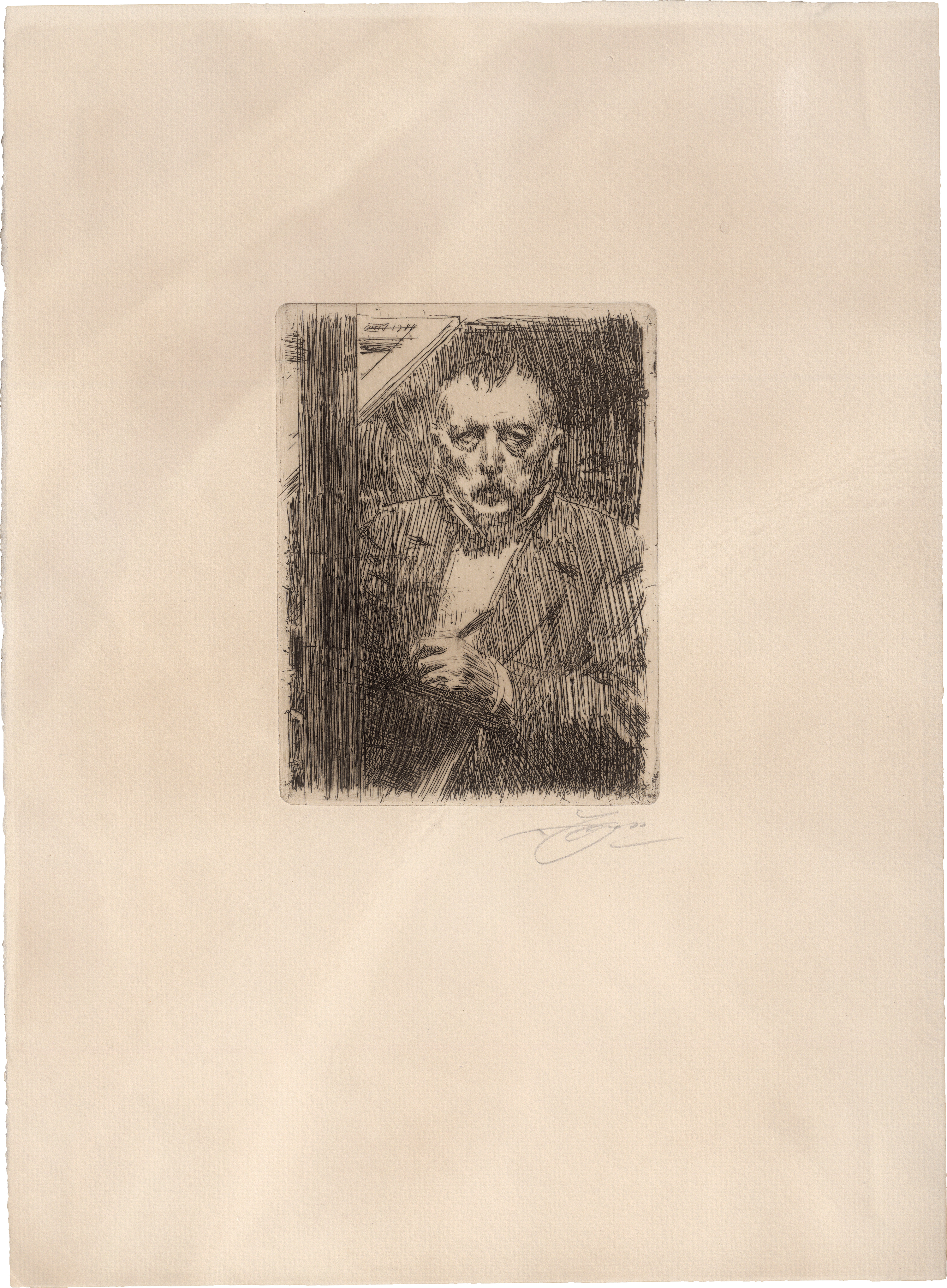Selbstbildnis 1911. Kaltnalradierung auf Bütten. 15,6 x 11,8 cm. Signiert. 1911. Nicht in Asplund und Delteil, Lidbeck ZG 241. Wz. Schrift 'Van Gelder Zonen' (Fragment).