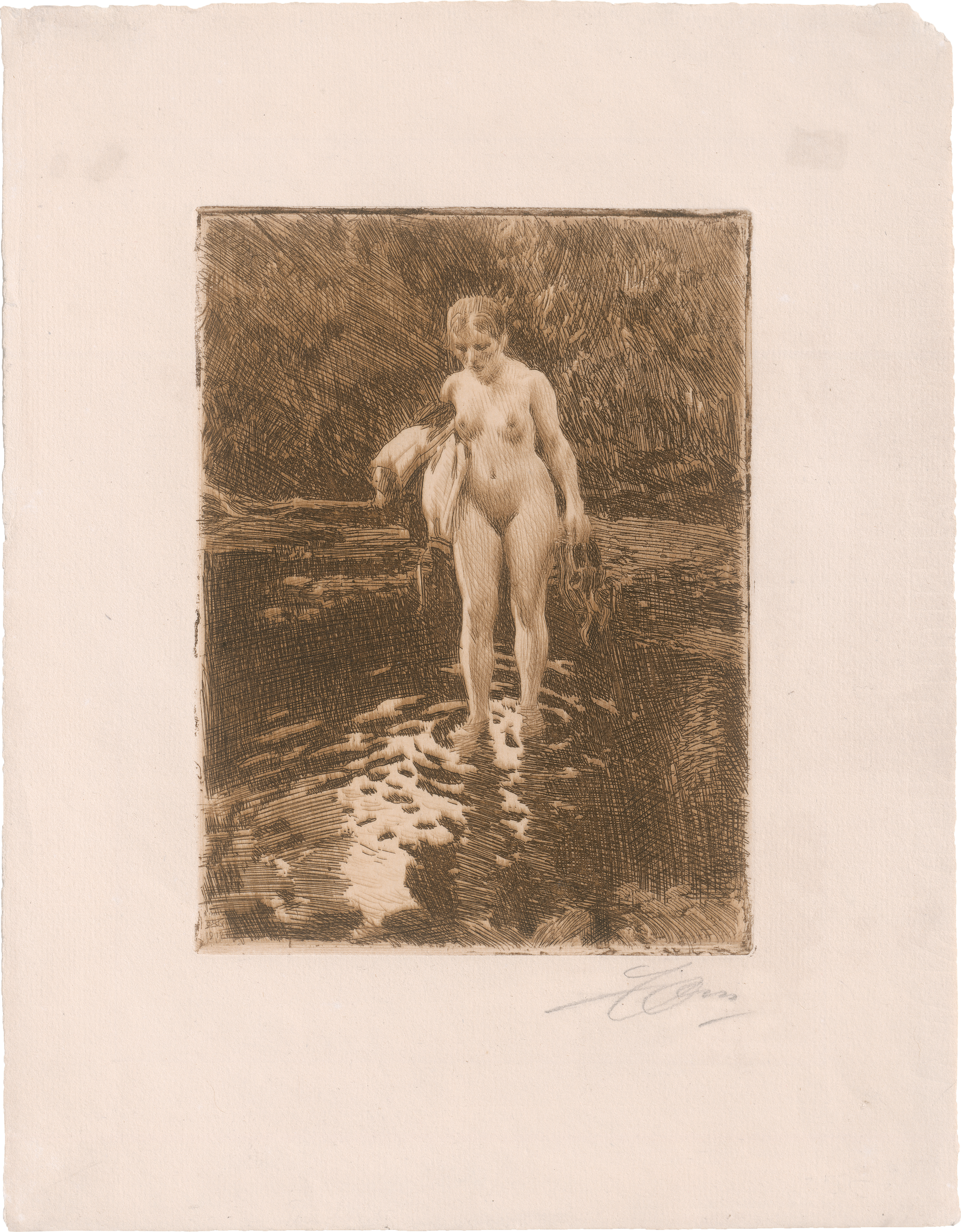 Die Furt. Kaltnadelradierung in Braun auf Bütten. 19,9 x 14,8 cm. Signiert. 1912. Asplund 249, nicht in Delteil, Lidbeck ZG 249 II. Wz. Schrift "Van Gelder Zonen" (Fragment).