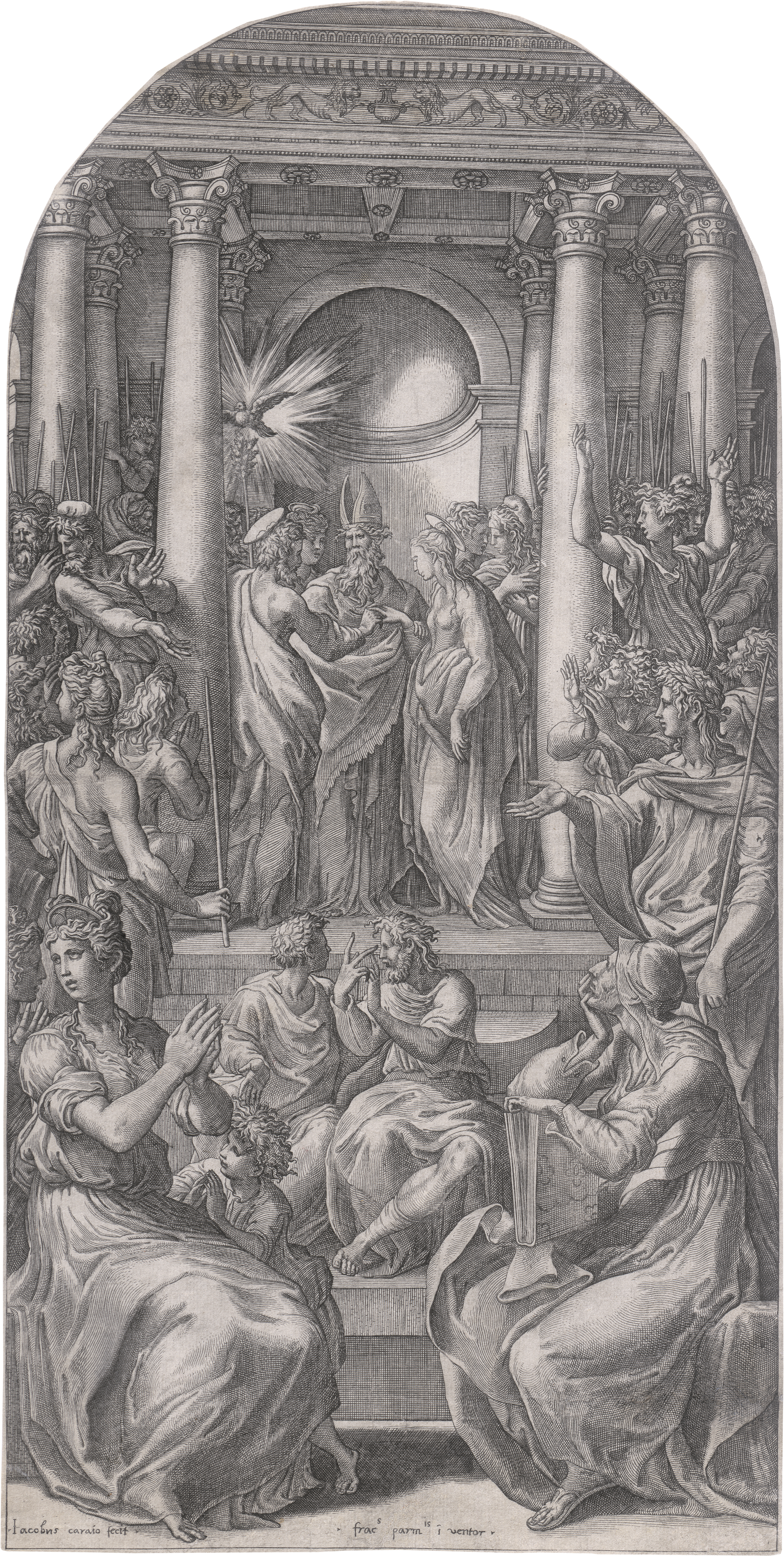 Die Hochzeit der Jungfrau. Kupferstich nach Parmigianino. 45,9 x 23,2 cm. B. 1, TIB (Commentary) .001 wohl S2 (von S3). Wz. Anker im Kreis.