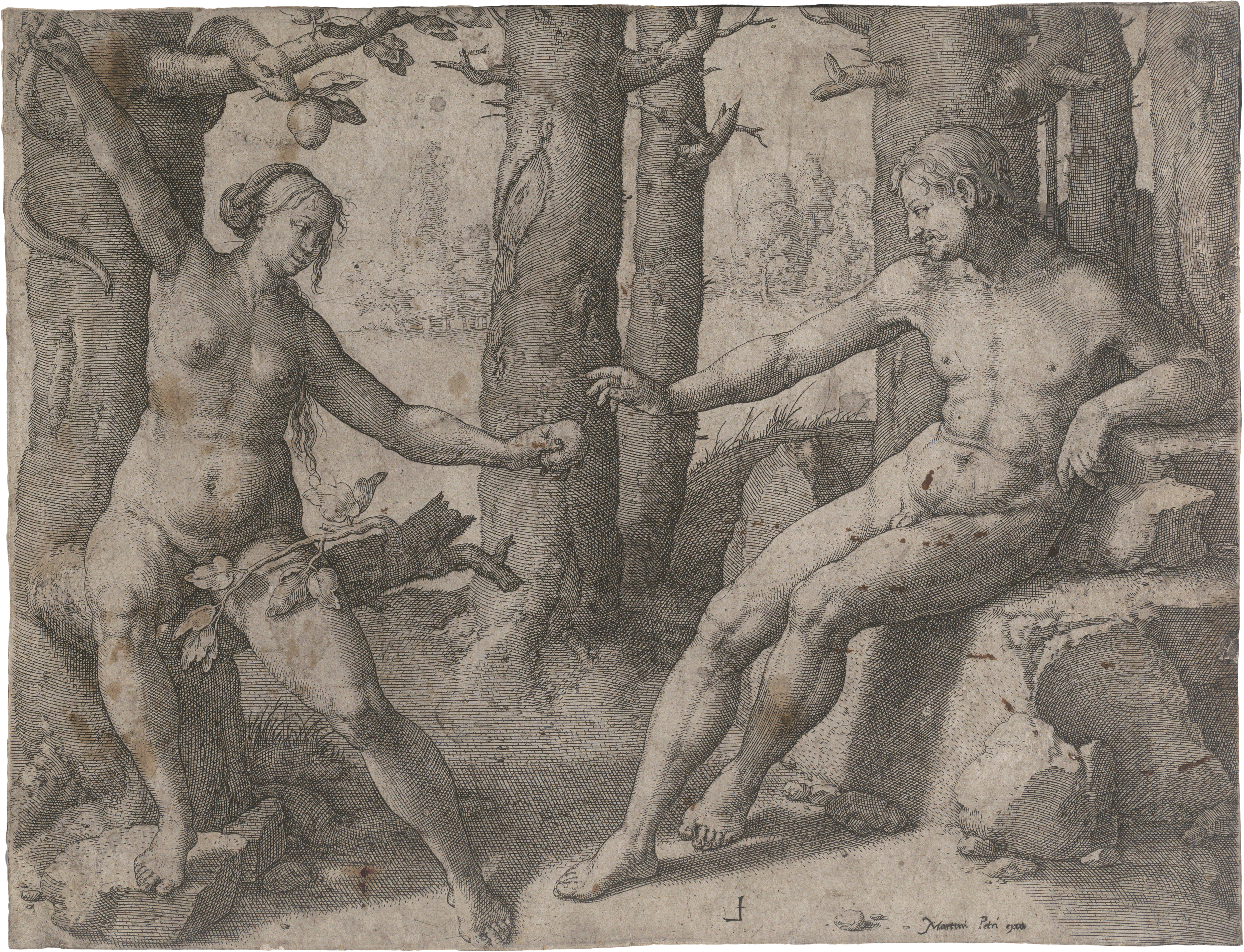 Der Sündenfall. Kupferstich. 11,9 x 8,8 cm. 1529. B. 9, Hollstein 9, Filedt Kok (New Hollstein) 9 III (von IV).