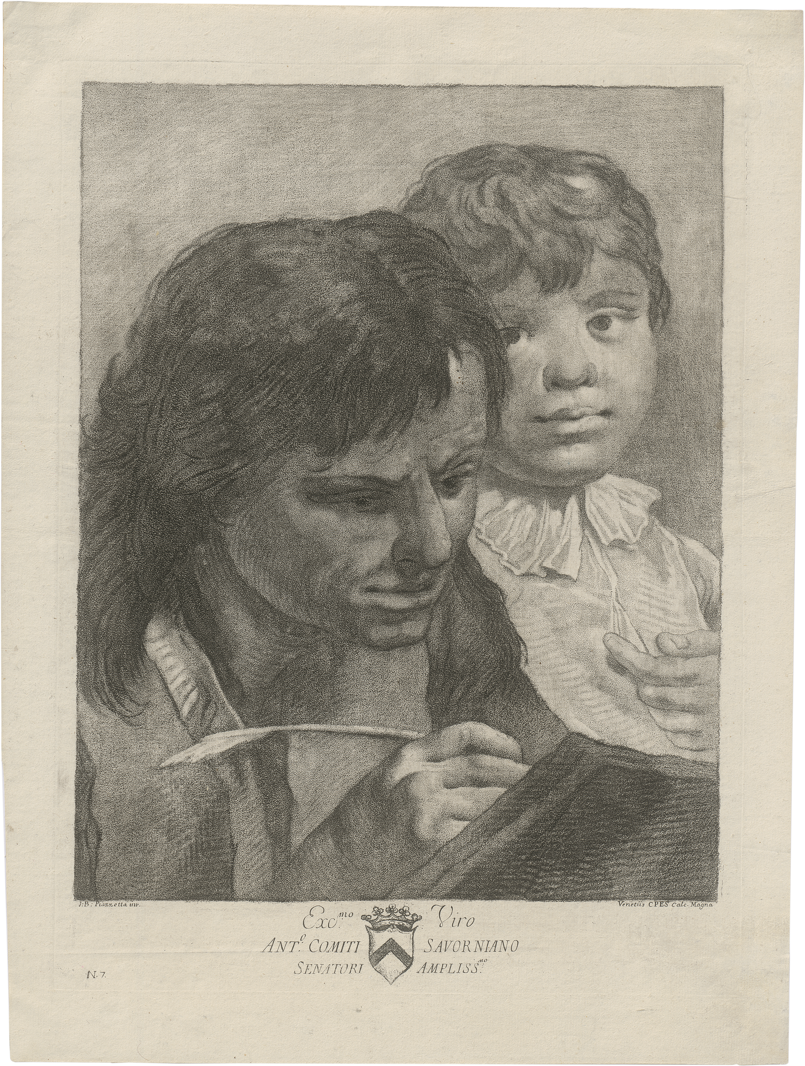 und Innocente Alessandri (1740/41-1803, Venedig). Ein schreibender Mann und ein Knabe. Radierung in Crayonmanier nach Giovanni Battista Piazzetta. 41,2 x 32 cm. M. A. Chiari Moretto Wiel, L’eredità di Piazzetta, volti e figure nell’incisione del Settecento, Venedig 1996, Nr. 177.