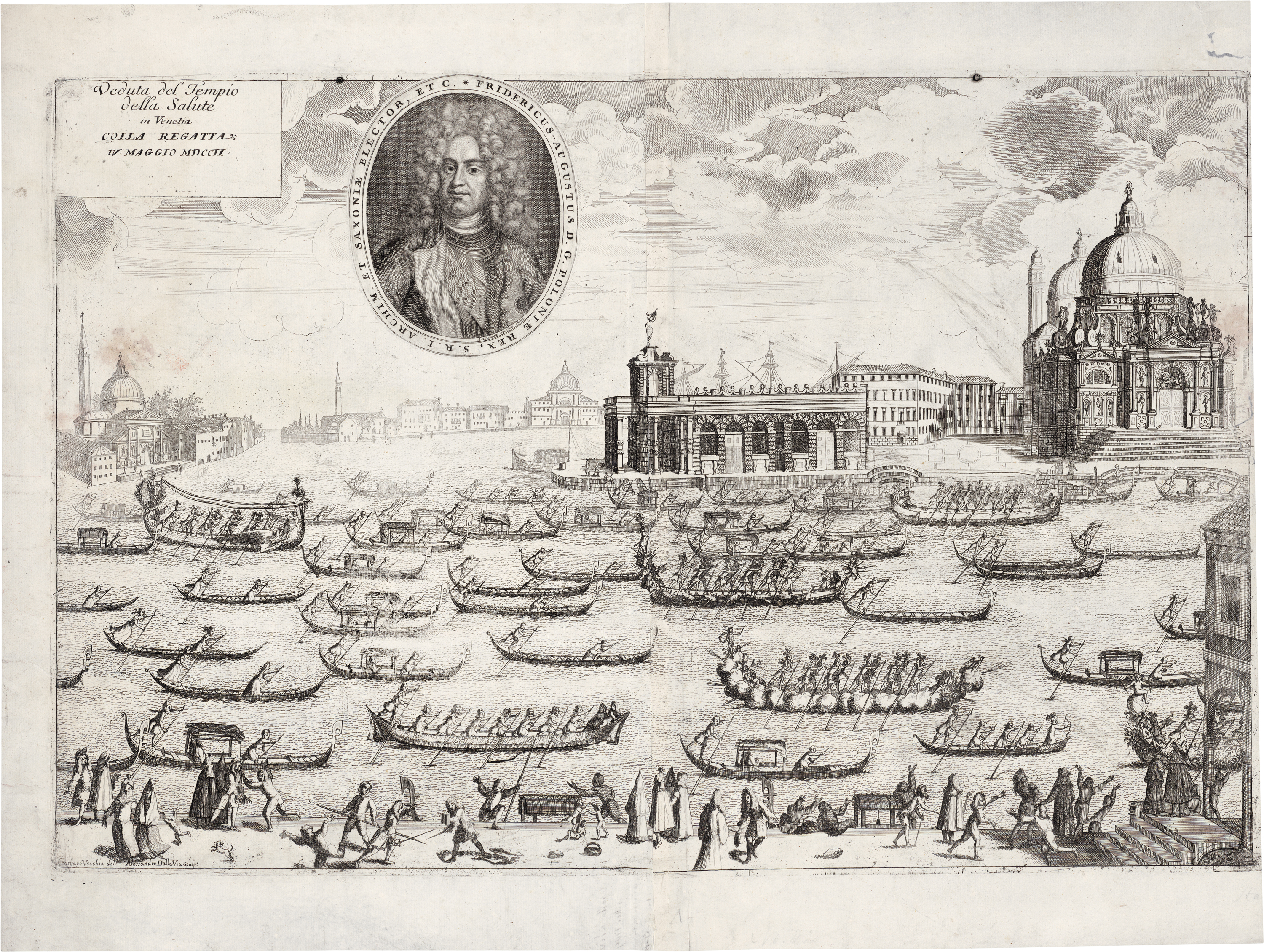 Veduta del Tempio della Salute: Regatta im Bacino di S. Marco, im Hintergrund die Dogana und Santa Maria della Salute sowie mit dem Bildnis Friedrich August I. von Sachsen. Radierung von zwei Platten auf zwei zusammengefügten Bogen nach Gasparo Vecchia. 42,7 x 65,2 cm. (1688). Nicht bei Le Blanc, Nagler, aus 6. Wz. Tre Lune.