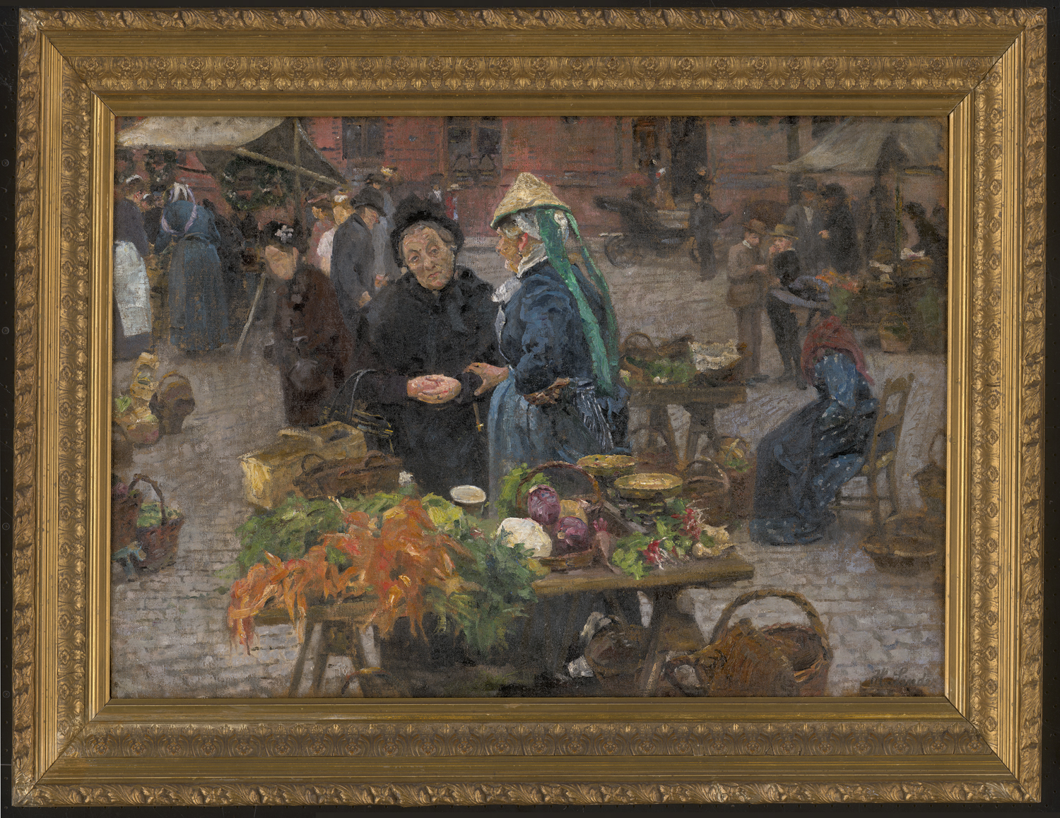 Im Zentrum des Bildes stehen zwei Frauen im Gespräch: eine Händlerin in blauer Tracht mit markantem grünem Schleier und Strohhut, und eine schwarz gekleidete ältere Dame. Die schwarze Kleidung und die Interaktion der beiden Frauen lassen vermuten, dass die Besucherin gerade einen Verlust erlitten hat und trauert, so legt die Marktfrau ihr zur Beileidsbekundung die Hand auf den Arm. Vor ihnen breitet sich der mit Sorgfalt arrangierte Verkaufstisch mit Möhren, Kohlköpfen, Rüben, Eiern und anderen bäuerlichen Produkten auf. Der Platz wird von weiteren Marktbesuchern, Händlern und Passanten belebt, während im Hintergrund ein spätmittelalterlicher Backsteinbau am Marktplatz eine verlässlich erkennbare Stadtkulisse bildet.