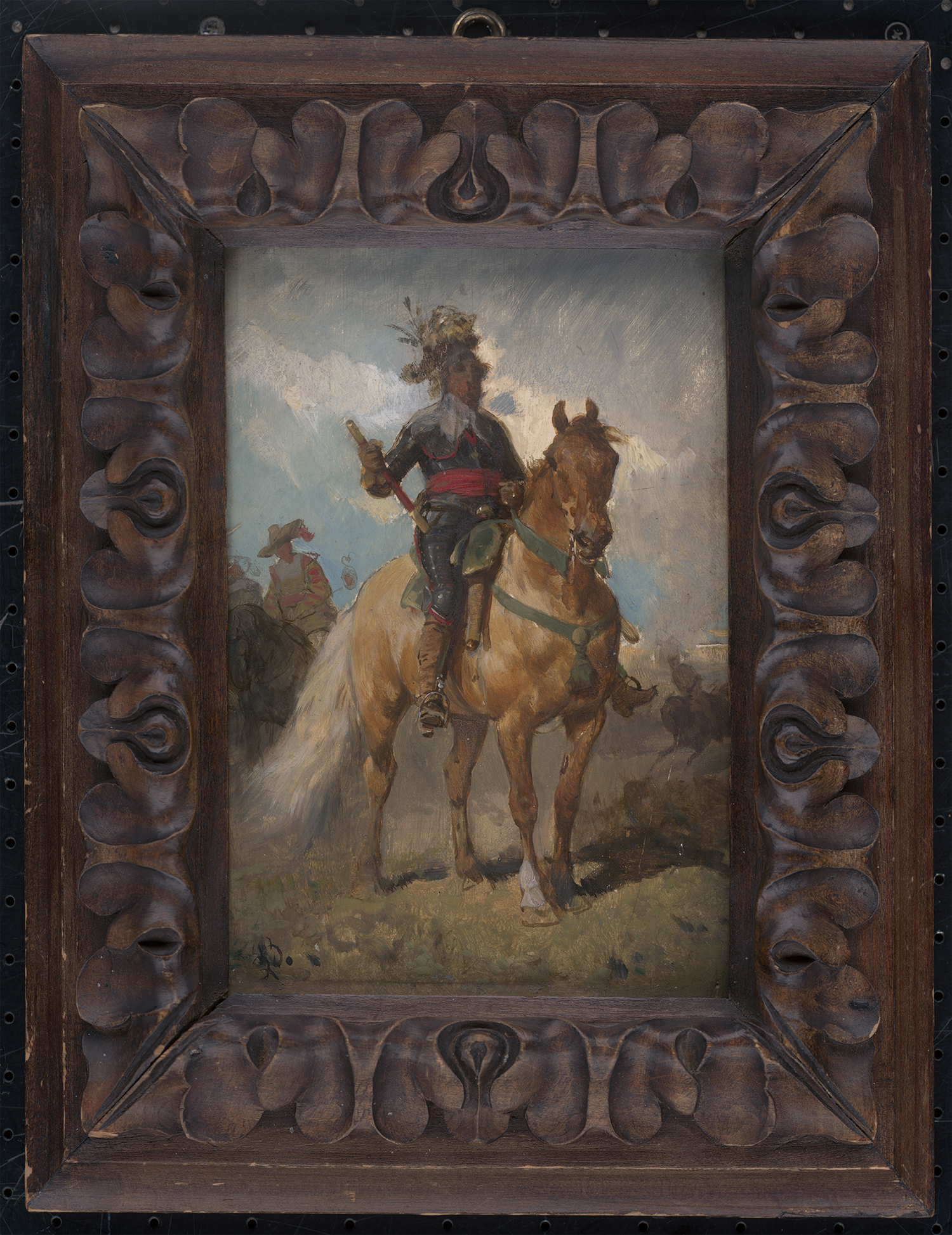 Louis Braun, seit 1889 Professor an der Münchner Akademie, zählt zu den berühmtesten deutschen Militärmalern. Die vorliegende Ölstudie, die möglicherweise Wallenstein oder Tilly darstellt, schenkte er dem befreundeten Frankfurter Bildhauer Fritz Schierholz (1840-1894) zu dessen 47. Geburtstag.