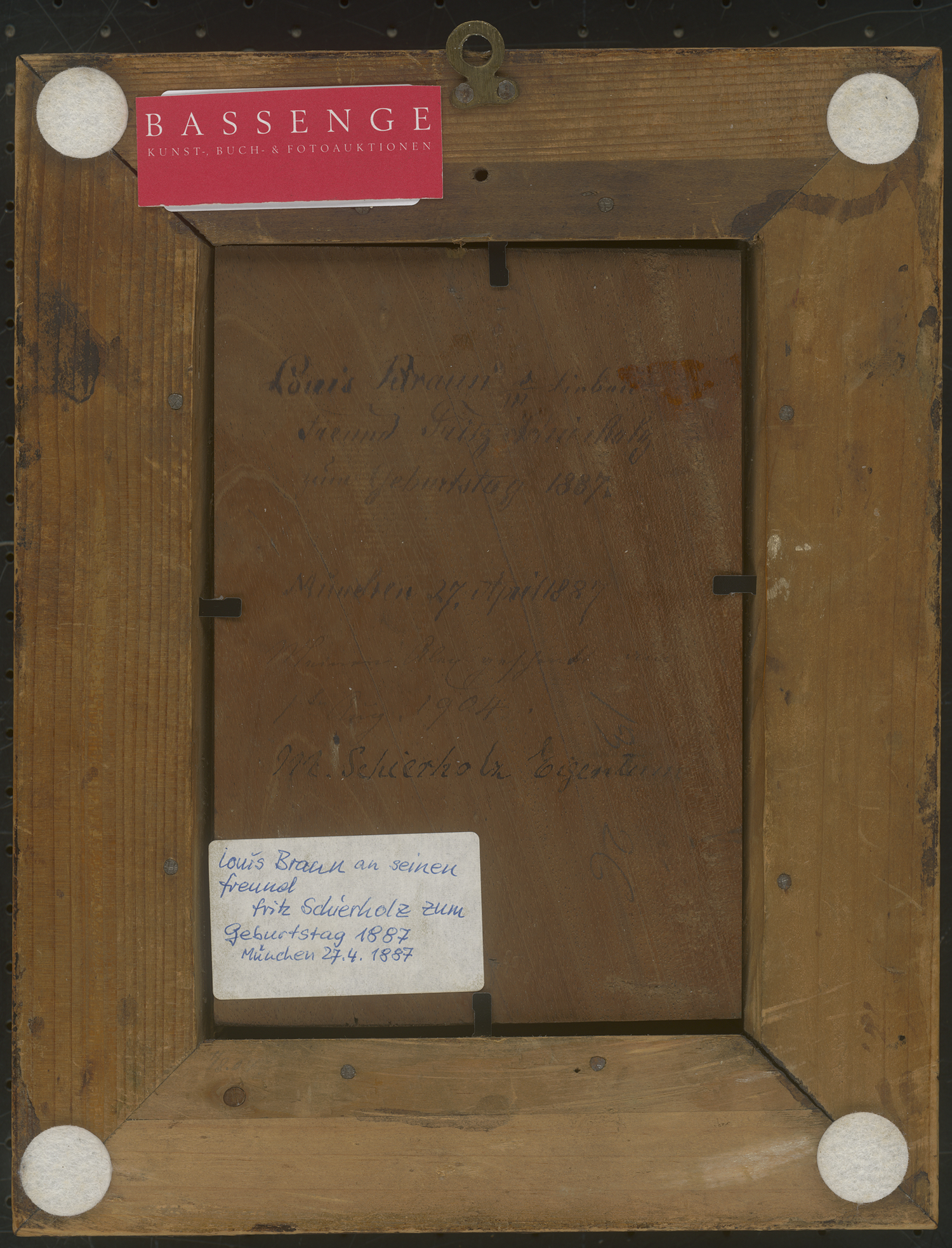 Öl auf Holz. 18,3 x 12,7 cm. Unten links monogrammiert "LB" (ligiert), verso bezeichnet "Louis Braun an seinen / Freund Fritz Schierholz / zum Geburtstag 1887. / München 27. April 1887".