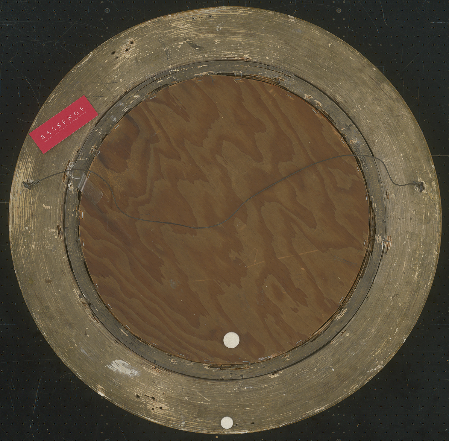 Holz geschnitzt, vergoldet und ebonisiert, mit geschnitzten Schleifen und Kugelelementen, mit eingelassenem Konvex-Spiegel. Durchmesser ca. 58 cm.