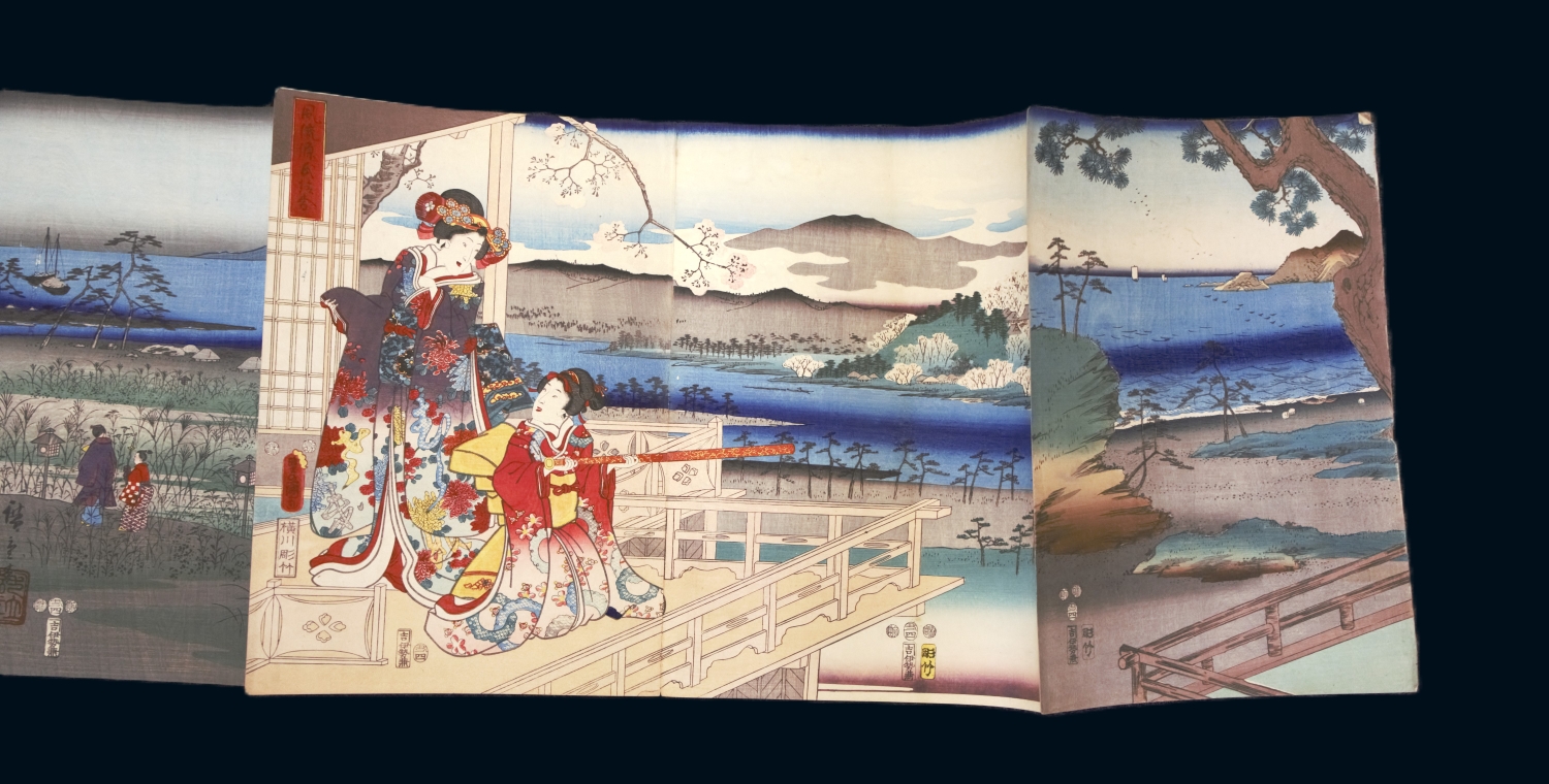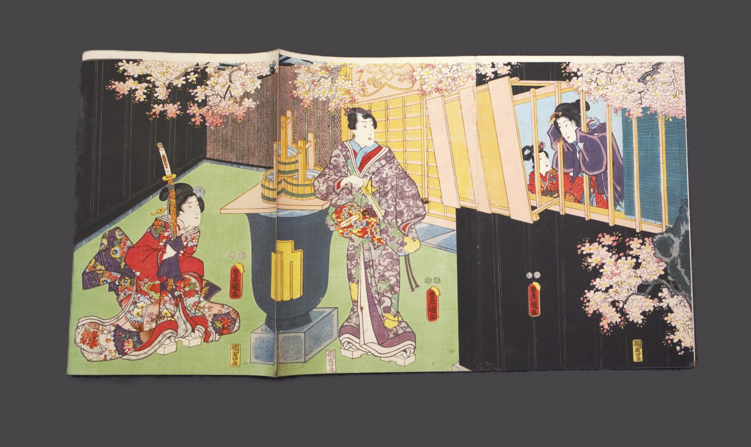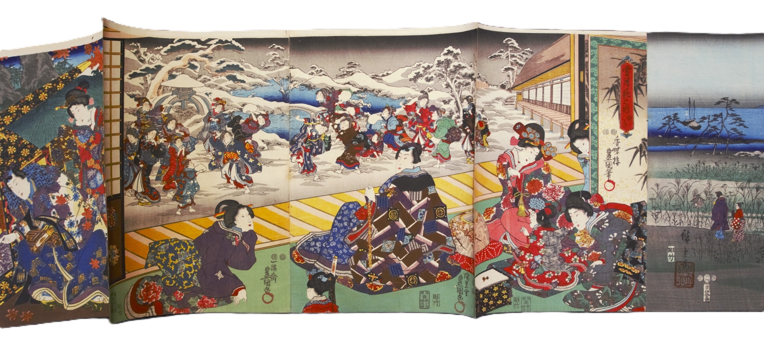 Die Blätter zeigen eine Bandbreite dekorativer und theatralischer Kompositionen: vornehmlich Gruppenbildnisse; Szenen aus Legenden und dem Kabuki-Theater mit heroischen Gestalten und eleganten Bijin. Diese in prachtvoll gemusterten, kostbaren Kimonos gewandet - dargestellt in atmosphärisch Szenerien: bei Schnee, unter Regenschleiern, zwischen herabgleitenden Ahornblättern oder blühenden Kirschbäumen; sowohl in opulenten Interieurs als auch in ausgedehnten Landschaften, bei Tageslicht oder auch bei Mondschein. – Die Triptycha sind teils in den Falzstellen gebrochen und das Leporello ist in drei Teilen erhalten. Die Ecken sind teils etwas bestoßen. Nur vereinzelt minimale Stockflecken und winzige Löchlein, überwiegend im Bereich der Falze, insgesamt in guter Erhaltung und die Farben in bemerkenswerter Frische.