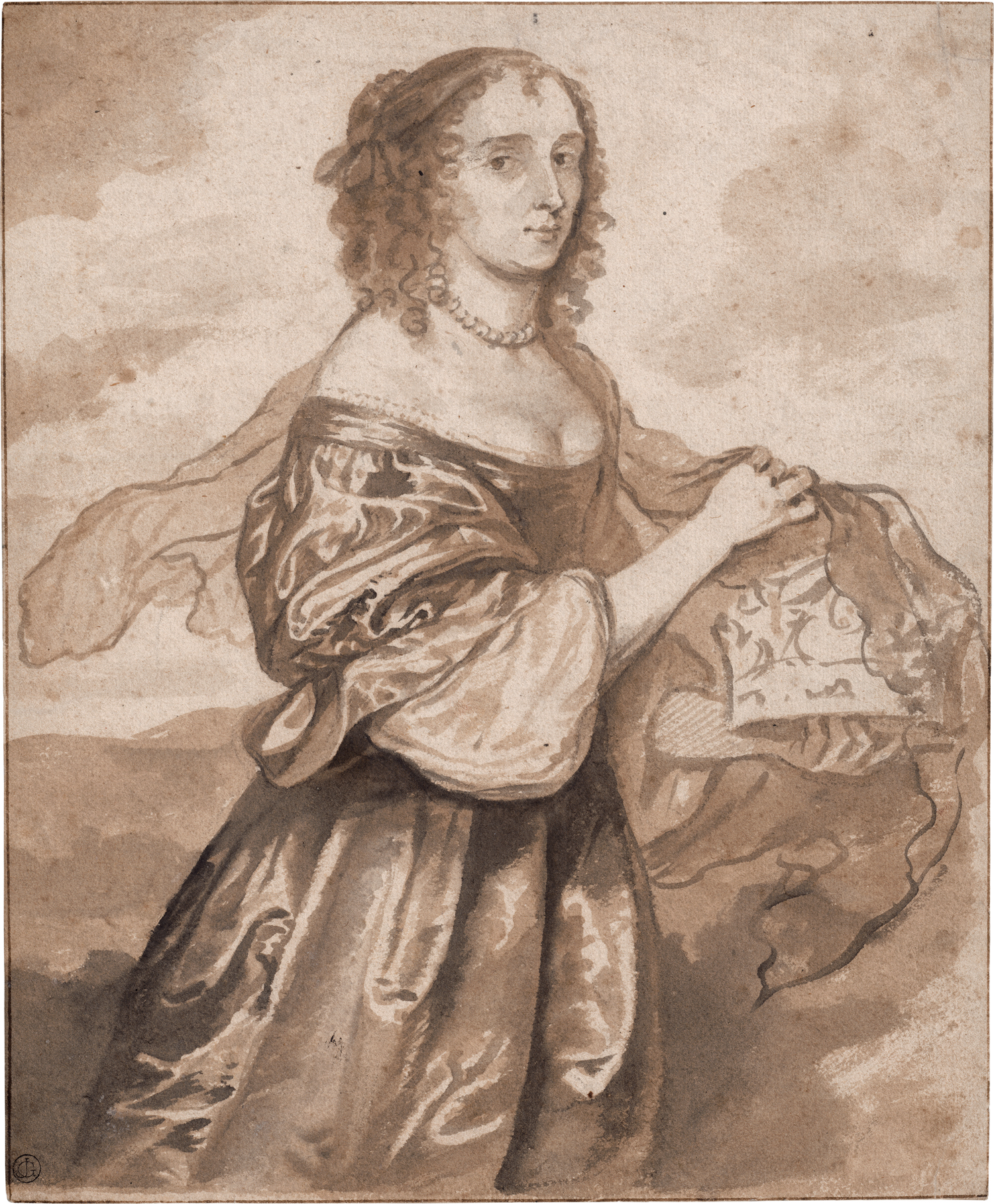 Das souverän ausgeführte Frauenbildnis ist eine charakteristische Arbeit des aus Heidelberg stammenden Malers und Zeichners Caspar Netscher, der bei Gerard ter Borch in die Lehre ging. Netscher war seit 1652 in Den Haag als angesehener Porträt- und Genremaler tätig. Mit großer Wahrscheinlichkeit handelt es sich bei der dargestellten jungen Frau um die famose Jane Lane, spätere Lady Fisher, die eine heroische Rolle bei der Flucht von König Charles II. nach Frankreich nach der verlorenen Schlacht von Worcester im Jahr 1651 gespielt hatte. Ein authentisches, 1652 datiertes Bildnis von der Hand des Meisters JH (möglicherweise Jerome Hesketh) in der Sammlung von Moseley Old Hall, Staffordshire (National Trust Collection) zeigt unverkennbare Ähnlichkeit mit der eleganten, modisch frisierten Frau auf unserem Blatt, die mit einem Schleier die Königskrone verhüllt, eine Anspielung auf die stattgefundene Flucht des Monarchen. Die gleiche Ikonographie ist auch auf einem anonymen, um 1660 entstanden Bildnis sichtbar, das in der National Portrait Gallery in London (NPG 1798) aufbewahrt wird.