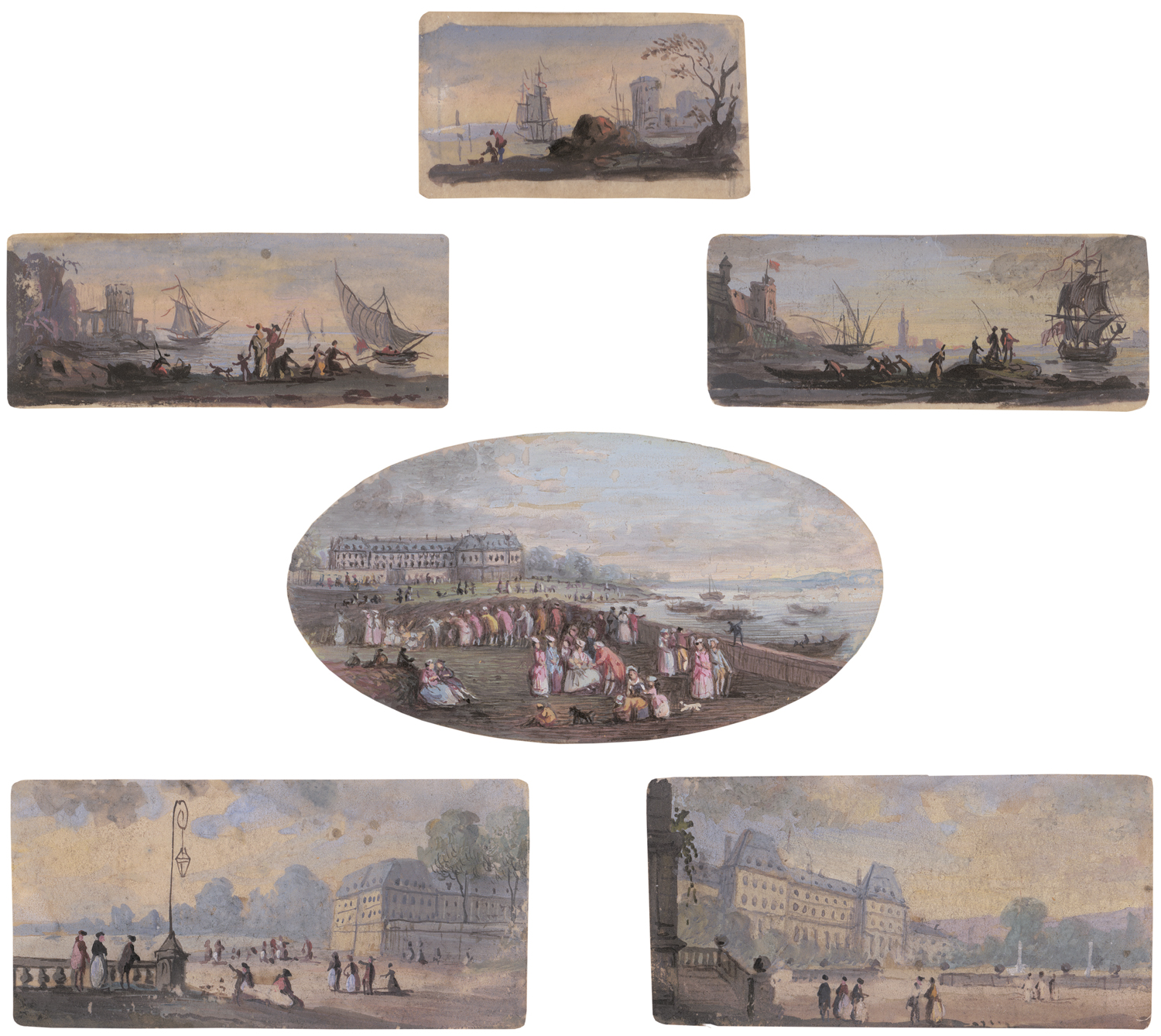 spätes 18. Jh. Tableaux mit 6 Ansichten französischer Schlösser und Häfen