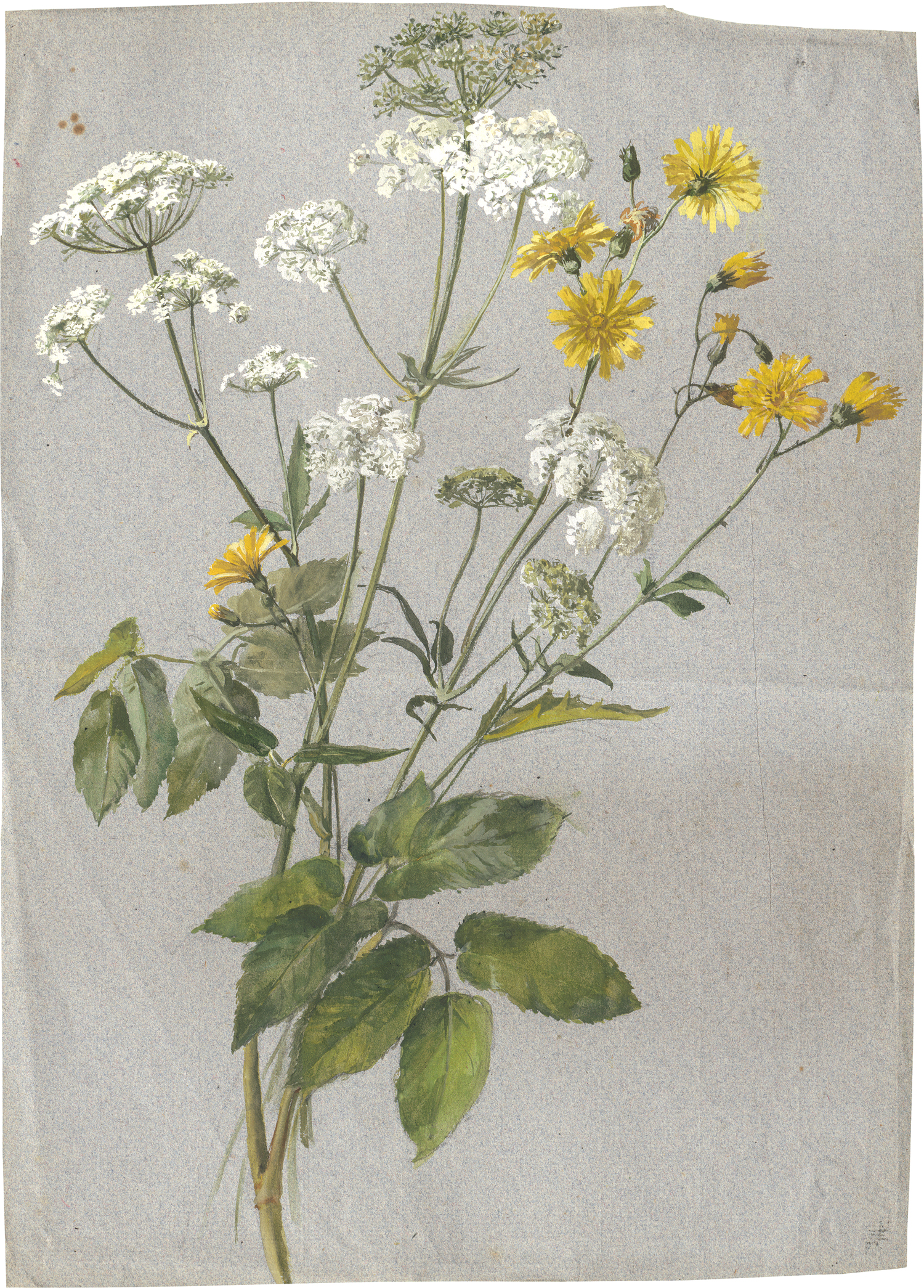 um 1840. Wiesenblumenstrauß mit Schafgarbe und kleinem Habichtskraut