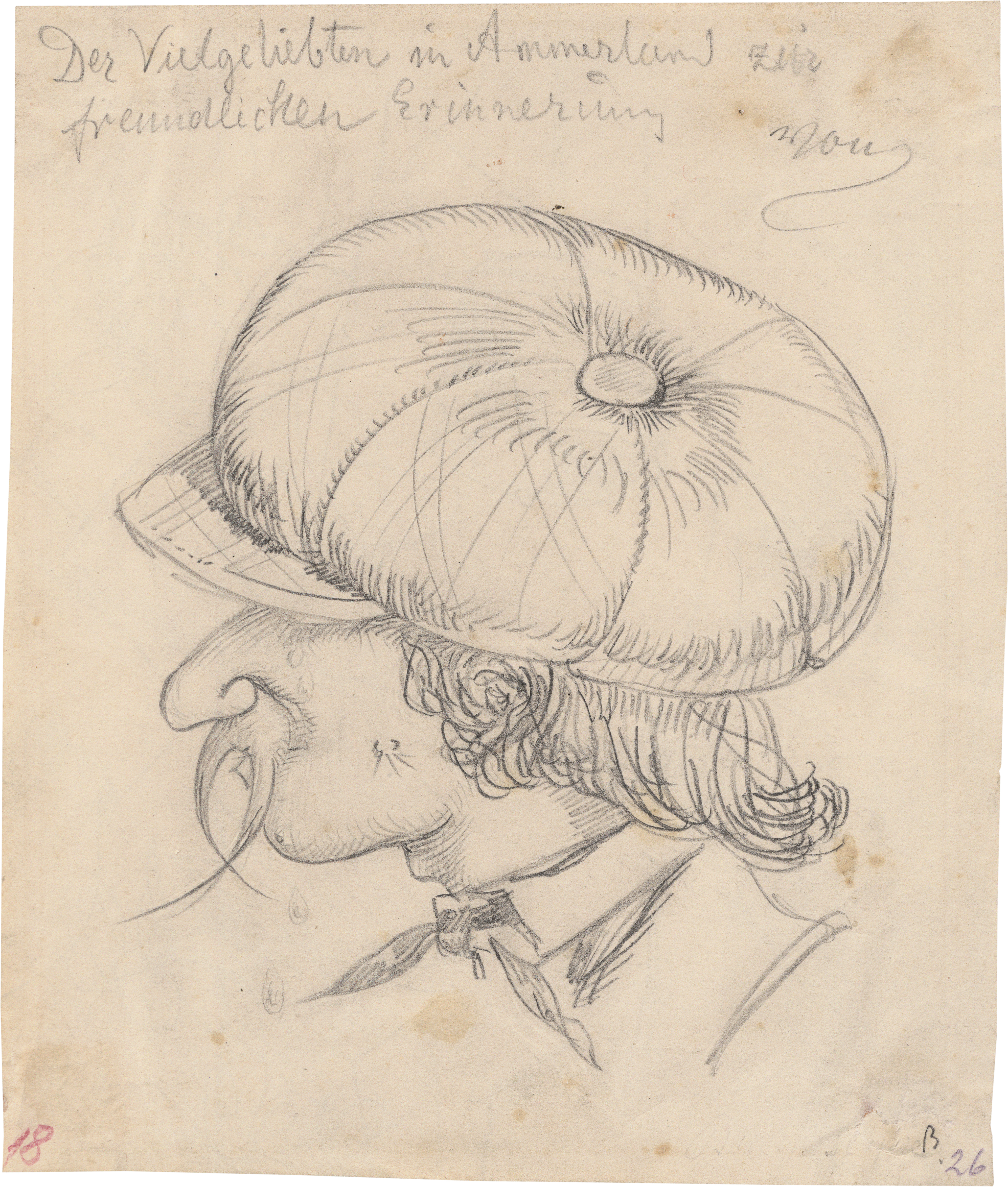 Bleistift auf Velin. 15 x 12,6 cm. Am Oberrand eigenh. bewidmet "Der Vielgeliebten in Ammerland zur freundlichen Erinnerung WBusch", unten links in rotem Stift "18", sowie unten links in Bleistift "B" und in violettem Stift "26". (1858).
