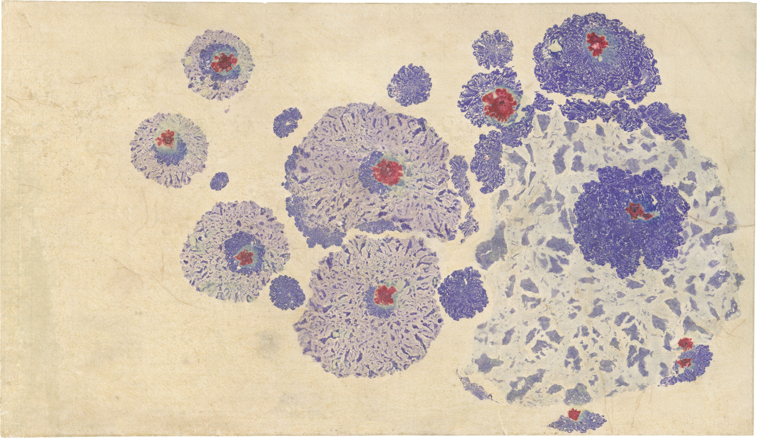 Wasserfarben aufgebracht im Tunkpapierverfahren (Marmoriertechnik) auf Bütten. 15,7 x 27,3 cm. Um 1906/07.