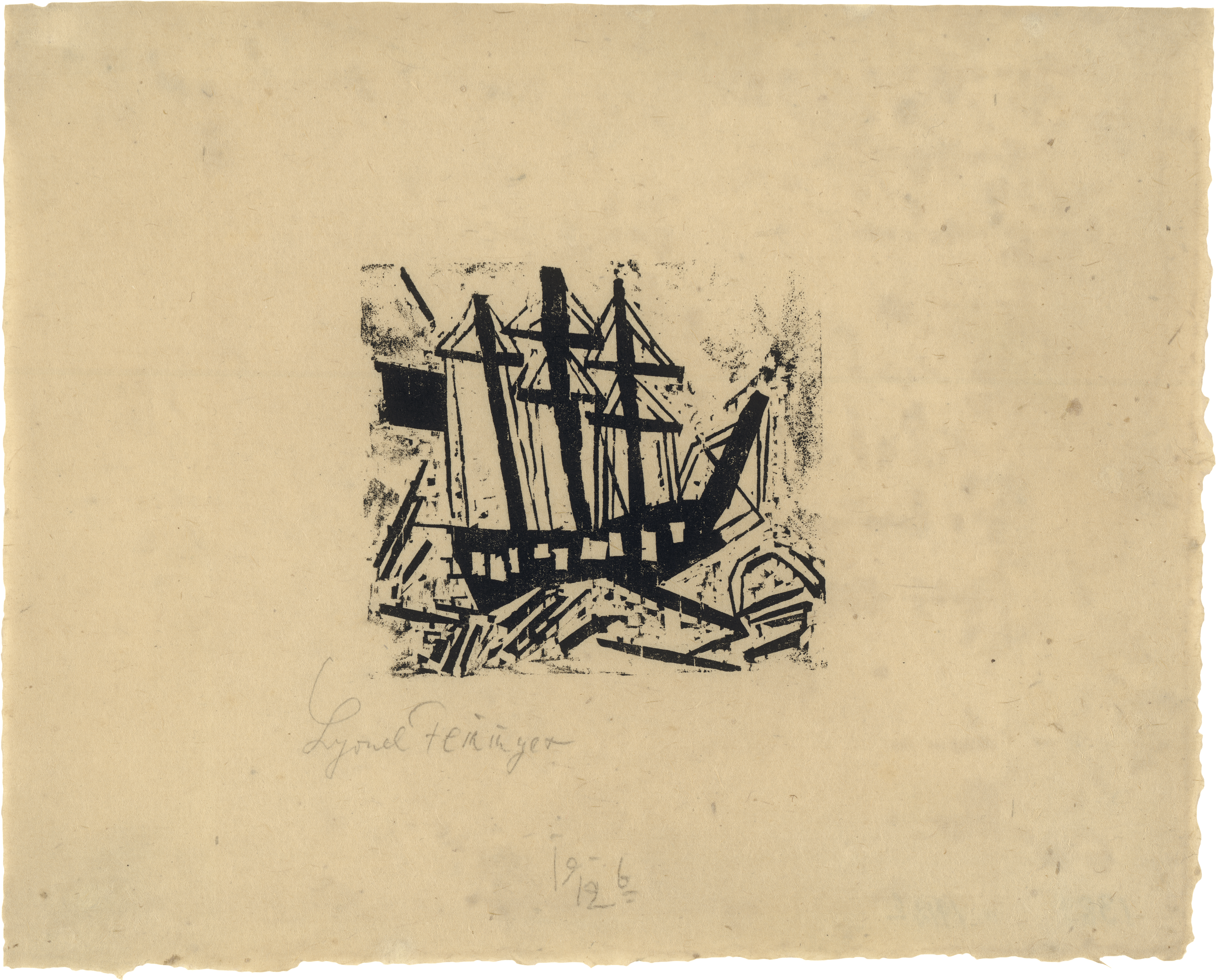 Der Holzschnitt in reizvollem kleinen Format entstand im Jahr 1919, als Walter Gropius Lyonel Feininger zum Leiter der graphischen Werkstatt ans Staatliche Bauhaus in Weimar berief. Feininger nutzte den Holzschnitt auch als Briefkopf. Prachtvoller, tiefschwarzer Druck mit breitem Rand. Sehr selten, Prasse kennt nur vier Probedrucke.