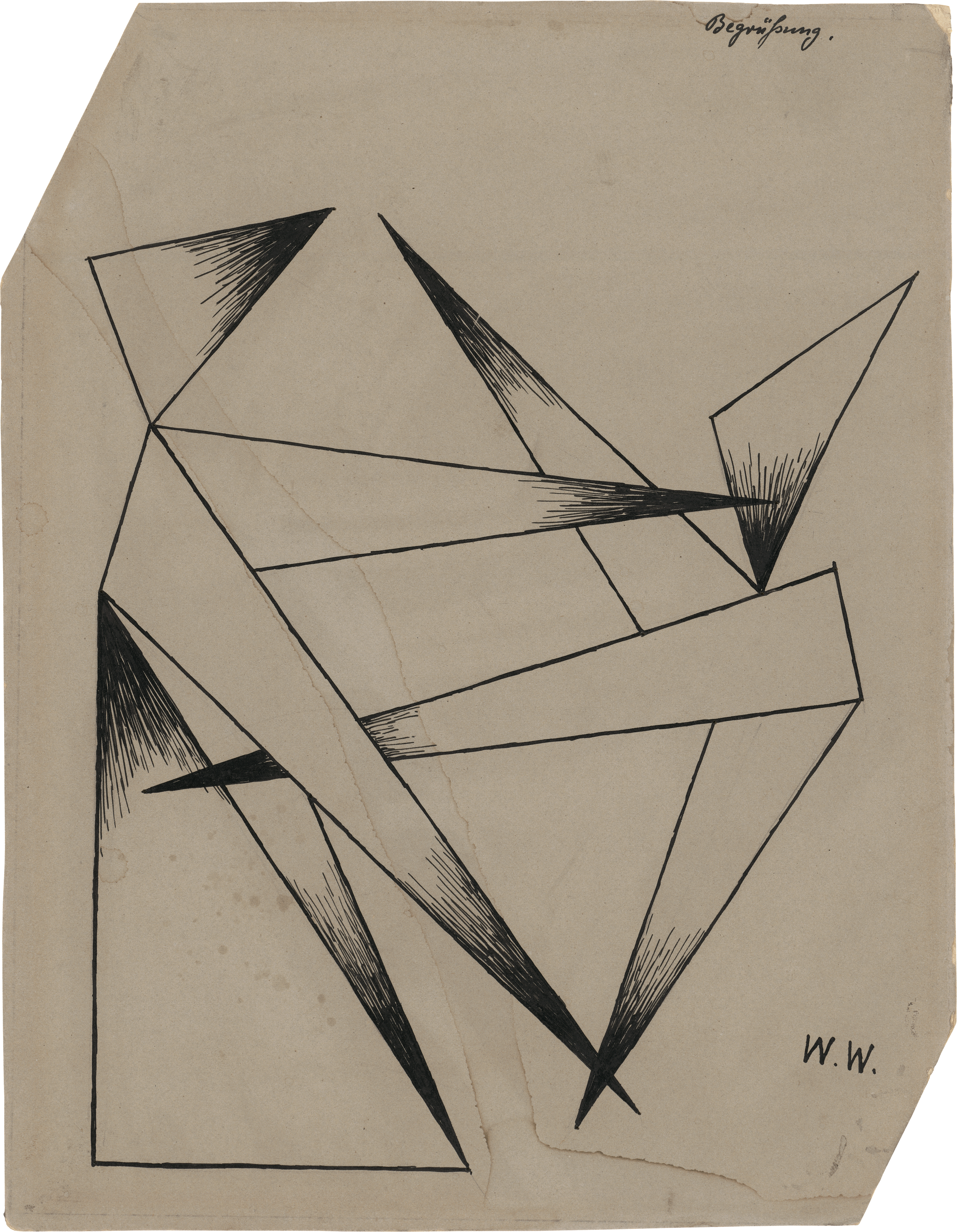 In raumgreifender Dynamik lässt Wauer aus schmalen Dreiecksformen die Begrüßung zweier Figuren entstehen. Die kontrastreiche Wirkung der Federschraffuren in den spitzen Ecken unterstreicht die Räumlichkeit und Bewegtheit der Darstellung. William Wauer, bereits seit 1912 Mitglied der Künstlergruppe "Der Sturm" in Berlin und dort einer der engsten Mitarbeiter Herwarth Waldens, zeichnet die spitzwinklig abstrahierte Komposition noch vor seiner Zeit am Bauhaus.  Beigegeben: Ein Siebdruck desselben Motivs von William Wauer, unten rechts mit der Stempelsignatur.