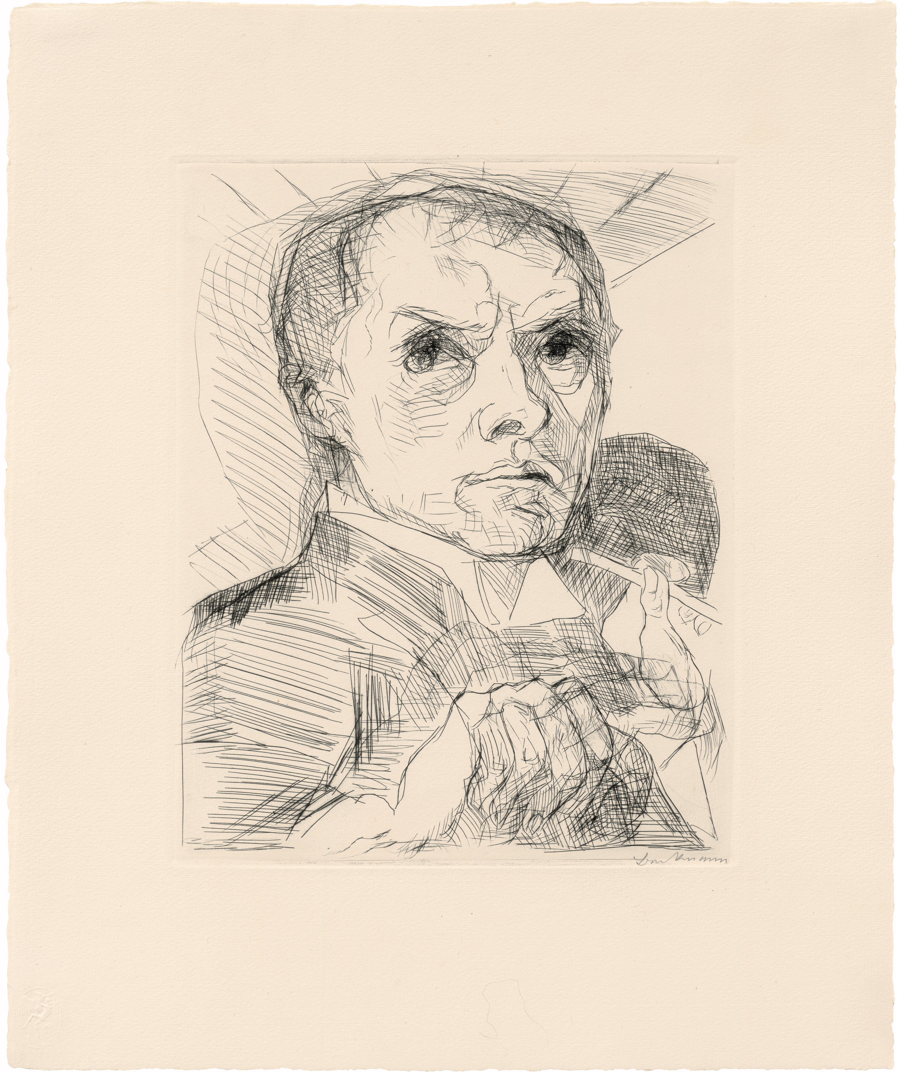 Blatt 19 der Folge "Gesichter", erschienen im Verlag der Marées-Gesellschaft, R. Piper & Co., München 1919, in einer Gesamtauflage von 100 Exemplaren mit dem Trockenstempel in der linken unteren Ecke. Neben 60 Exemplaren auf Bütten wurden zunächst 40 Drucke von der noch unverstählten Platte für die Luxusausgabe der Mappe auf Japan abgezogen. Der Prospekt der Marées-Drucke, der das Erscheinen ankündigte, warb mit dem "Selbstbildnis mit Griffel", verkleinert abgebildet. Anfangs plante Beckmann die Veröffentlichung zwei getrennter Portfolios: eines ausschließlich mit Kriegsbildern und das andere mit Eindrücken des Großstadtlebens, das Beckmann "Welttheater" nennen wollte. Durch Julius Meier-Graefes Anregung erschienen die Arbeiten dann aber zusammengefasst in einer Mappe unter dem Titel "Gesichter".  Die 19 Blätter der Folge bilden keine narrative Sequenz, sondern Momentaufnahmen des Lebens. Beckmanns eigenes Gesicht erscheint darin leitmotivisch in mehreren Portraits, eines zu Beginn, mit dem er in den Zyklus einführt, und das hier vorliegende als Schlussbild; "geläutert geht er aus diesen Szenen hervor, erstarkt und in höchster Spannung wachsam. Er ist nicht mehr der abweisende Beckmann in gedrückter Haltung des ersten Selbstbildnisses: der Zyklus ist geschlossen, ein neuer Anfang ist offen" (B. Haldner, in: Gesichter von Tag und Traum: aus dem graphischen Werk von Max Beckmann, Ausst.-Kat. ETH Zürich 1984, S. 40). Max Beckmann zeichnete, malte, radierte und lithographierte so zahlreiche Selbstportraits wie kaum ein anderer Künstler der Moderne. Das "Selbstbildnis mit Griffel" ist ein herausragendes Beispiel für seine künstlerische Selbstbefragung, für die energische Auseinandersetzung mit dem eigenen Angesicht, seine Suche nach dem "wahren" Selbst hinter der äußeren Erscheinung, und zugleich zeigt es den Künstler im Zusammenhang der "Gesichter" hellsichtig gegenüber den alptraumhaften Verwerfungen des Ersten Weltkrieges. Druck des endgültigen Zustandes von der verstählten Platte, in einem prachtvollen, klaren Abzug mit dem vollen Rand.
