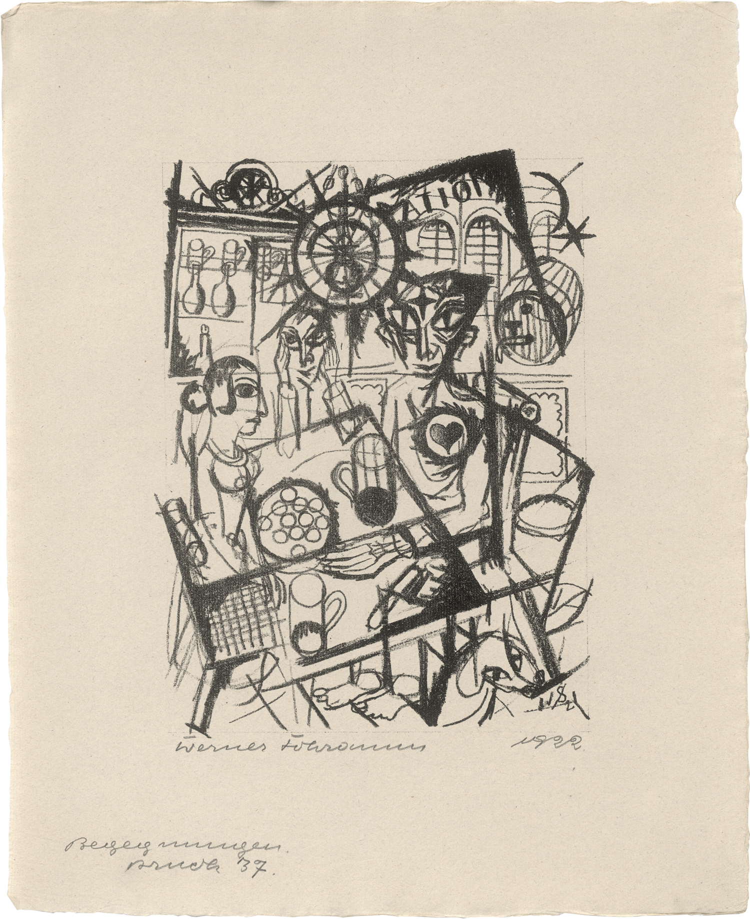 Im Druckvermerk signiert, die Lithographien jeweils signiert "Werner Schramm", datiert und bezeichnet "Begegnungen Druck 37", das Gedichtblatt signiert "Kurt Heynicke". Auflage 70 num. Ex.