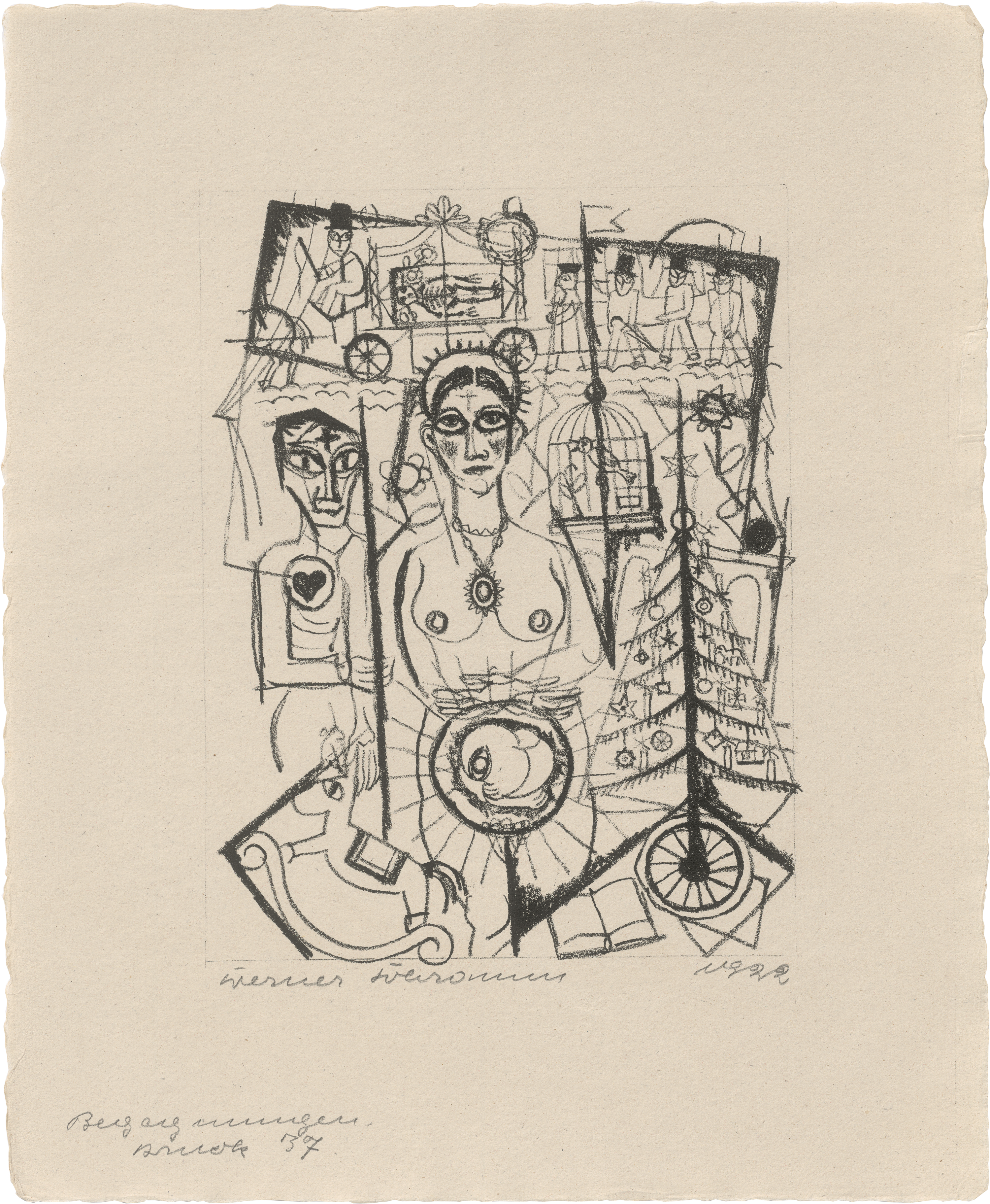 Die komplette Mappe der ausdrucksvollen Lithographien, erschienen als XVIII. Werk im Verlag der Galerie Alfred Flechtheim, Düsseldorf, Berlin und Frankfurt am Main. Werner Schramm wurde nach seiner Ausbildung an der Kunstgewerbeschule Düsseldorf und an der Münchner Kunstakademie Mitglied der Künstlervereinigung "Das Junge Rheinland". 1937 wurde sein Schaffen und insbesondere die Mappe "Begegnungen" als "entartet" diffamiert. Prachtvolle, klare Drucke mit dem vollen Rand. Werke von Werner Schramm sind auf dem Kunstmarkt selten.