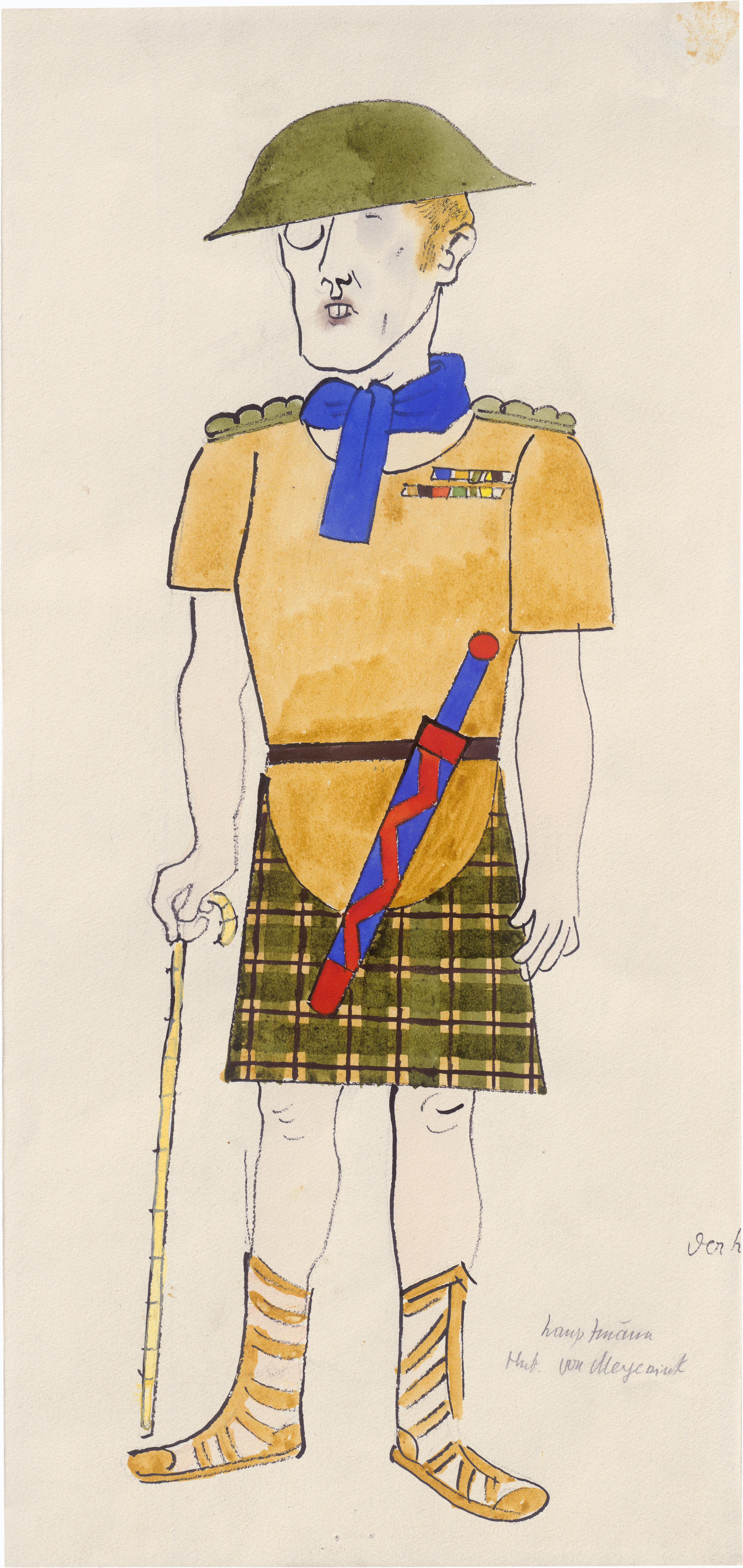 Die faszinierende Welt des Theaters und des Kabaretts zog im brodelnden Berlin der 1920er Jahre viele Künstler in ihren Bann - so auch George Grosz. Mit nahezu allen Theaterregisseuren jener Zeit war er bekannt oder pflegte enge Freundschaften. Es ist also naheliegend, dass sich Grosz auch mit großer Hingabe dem Entwurf von Bühnenbildern, Kostümen und Figurinen zuwandte und seine Ideen mit größtmöglicher Fantasie umsetzte. 1924 stattete er die Komödie „Androklus und der Löwe" aus, die George Bernard Shaw 1912 als Nacherzählung des antiken Sklavenmärchens schrieb. Fotos von der Aufführung im Residenz-Theater belegen eine detailgenaue Übernahme der Grosz‘schen Entwürfe. Unser Blatt zeigt die Figur des Hauptmanns, dessen Rolle im Stück der Schauspieler Hubert von Meyerinck (1896-1971) übernahm. Grosz zeichnet ihn bewusst überspitzt als eigenständigen Typen und nicht als römischen Soldaten. Er kleidet ihn in einer Mischung aus traditioneller schottischer Tracht und militärischer Uniform, ergänzt durch römische Schnürsandalen, einen viel zu großen Stahlhelm und ein zeittypisches Monokel am rechten Auge. Nicht zuletzt wegen der grotesken Gesichtszüge des Mannes, die fast schon einer Fratze gleichen, gelingt dem großen Satiriker Grosz statt einem reinen Kostümentwurf ein beispielhaftes Typenportrait. Verso mit einer weiteren Bleistiftzeichnung. Wir danken Ralph Jentsch, Berlin, für freundliche Hinweise. Die Arbeit wird in das in Vorbereitung befindliche Werkverzeichnis der Arbeiten auf Papier aufgenommen.