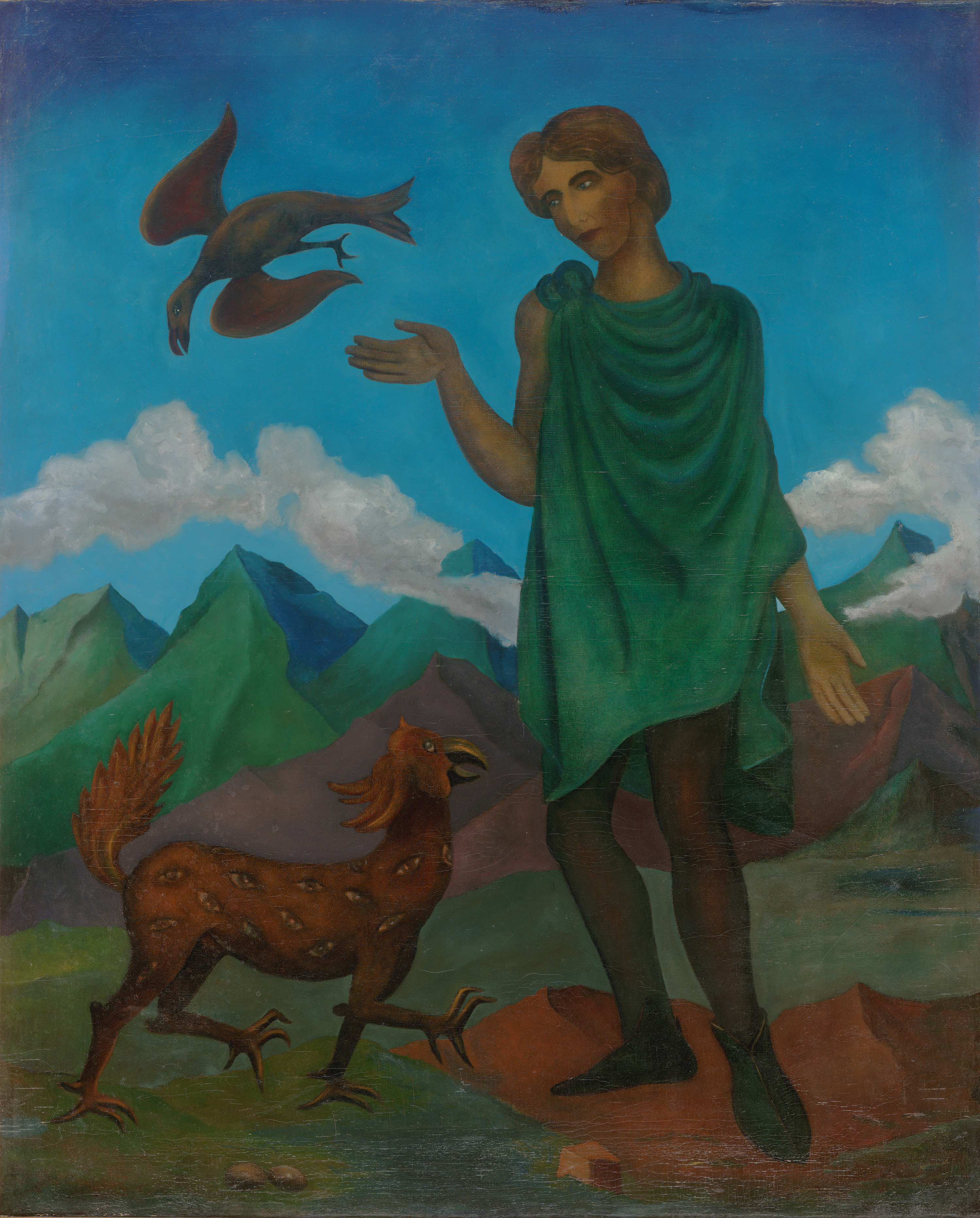 Der Gute Hirte in Begleitung eines skurrilen Mischwesens, ähnlich einem Greif, das Fell durchsetzt mit menschlichen Augen - einem zentralen Motiv des Surrealismus. Am tiefblauen Himmel kreist darüber ein Vogel. Marc Eemans, einer der bedeutendsten Vertreter des belgischen Surrealismus, war auch Dichter und Kunstkritiker. Er galt anfangs noch als Pionier des abstrakten Konstruktivismus, bevor er sich um 1925 dem Surrealismus zuwandte. Bereits damals stellte er zusammen mit René Magritte und Salvador Dalí in der Pariser Galerie von Camille Goemans aus, wandte sich jedoch bald dem Magischen Realismus zu.