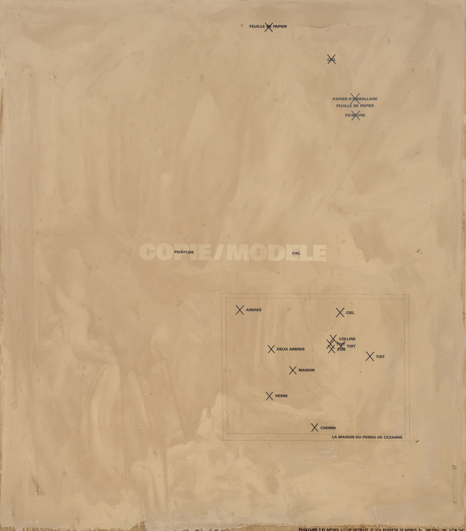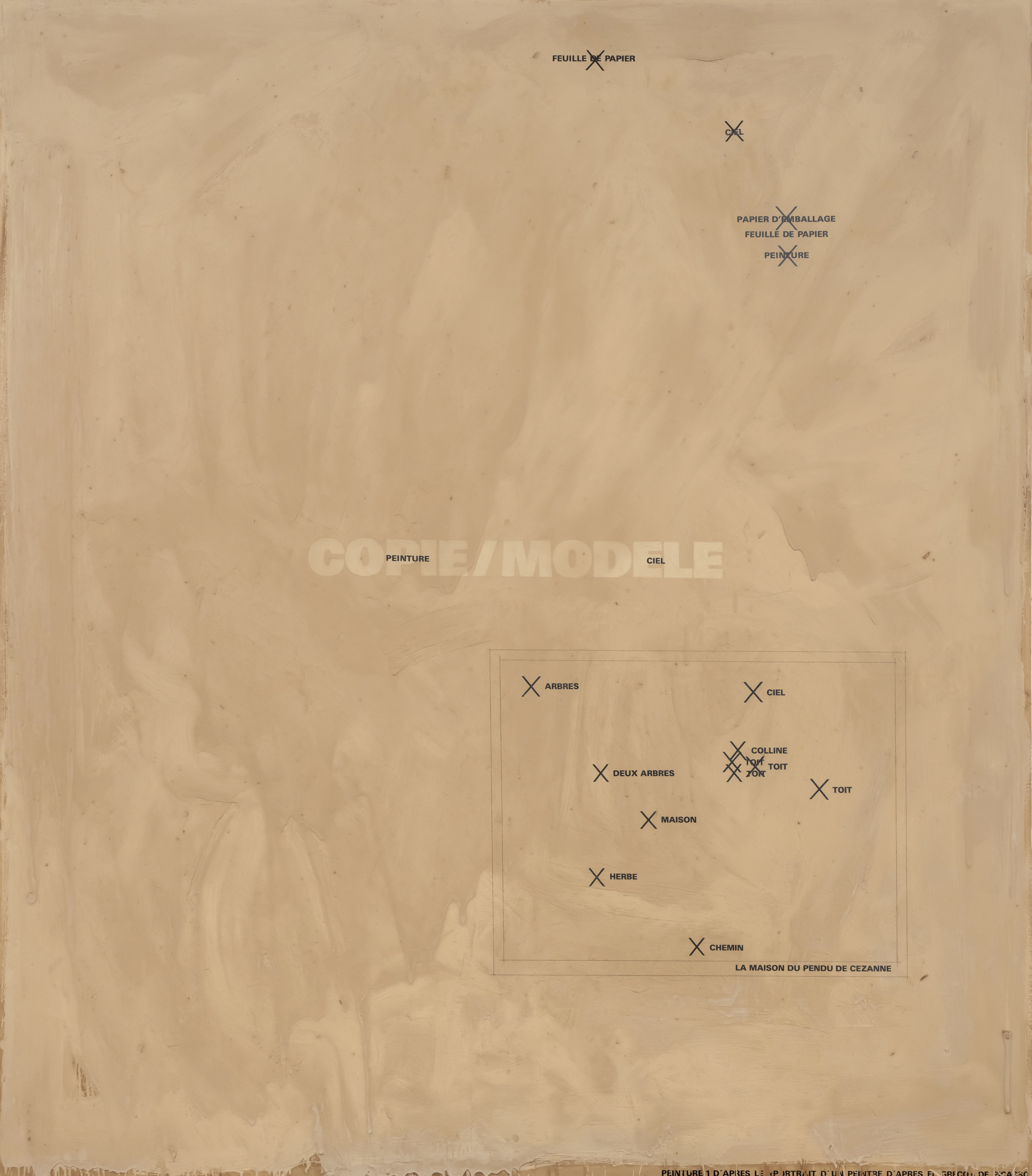 Die Arbeiten aus der Werkgruppe Une feuille de papier des Schweizer Malers und Konzeptkünstlers Rémy Zaugg verweisen auf das Offensichtliche: ein leeres Blatt, und zugleich auf das Fragezeichen, das mit dem Blick auf dieses scheinbar Unmittelbare verbunden ist. Das Papier wird zum Ausgangspunkt der Reflexion über Wahrnehmung, Form und Bedeutung. Ab 1973 beginnt Remy Zaugg Backpapiere, die er in seinem Atelier findet, mit Farbe in ähnlich bräunlichem Ton zu bedecken und einige wenige von ihnen auf Leinwand zu kaschieren. „In den auf diese Weise bemalten Papierbogen (erkennt Zaugg) die grundlegende Ambivalenz der Malerei, wie sie sich gegen Ende des 20. Jahrhunderts darstellt: Die braune Farbe verweist einerseits auf das braune Papier, das ihr Träger ist, anderseits auf sich selbst; sie repräsentiert das Blatt Papier und sie ist selbst als Material präsent.“ (Gerhard Mack, Rémy Zaugg. Eine Monographie, 2005, S. 88). Über Jahre arbeitete der Künstler an der für ihn unabschließbaren Werkgruppe, da im künstlerischen Prozess immer neue Bedeutungsnuancen für den Künstler sichtbar wurden. So verbindet Zaugg das übermalte Papier seit Ende der 1970er Jahre mit einzelnen Wörtern, welche häufig, als Gebrauchsanweisungen übereinandergelegt, ein unentwirrbares Gemisch aus Bezügen bilden. Mit Sprache „projiziert (er) Gemälde anderer Maler, die sich bereits auf Gemälde wiederum anderer Maler beziehen, auf das Papier und paraphrasiert sie mit brauner Farbe“ (Gerhard Mack, S. 89). Unsere zweiteilige Arbeit enthält den Titel eines Gemäldes von Paul Cézanne, welches 1874 auf der ersten impressionistischen Ausstellung in Paris präsentiert wurde. Während Zauggs vierzigjähriger Karriere, die in den 1970er Jahren begann, beschäftigte sich der Künstler intensiv mit der menschlichen Wahrnehmung. Seine Gemälde, Arbeiten auf Papier, öffentlichen Skulpturen, architektonischen Entwürfe, kuratorischen Arbeiten und Kritiken untersuchen, wie Sehen und Bewusstsein miteinander verbunden sind. Am bekanntesten ist er für seine textbasierten Gemälde in verschiedenen Sprachen.