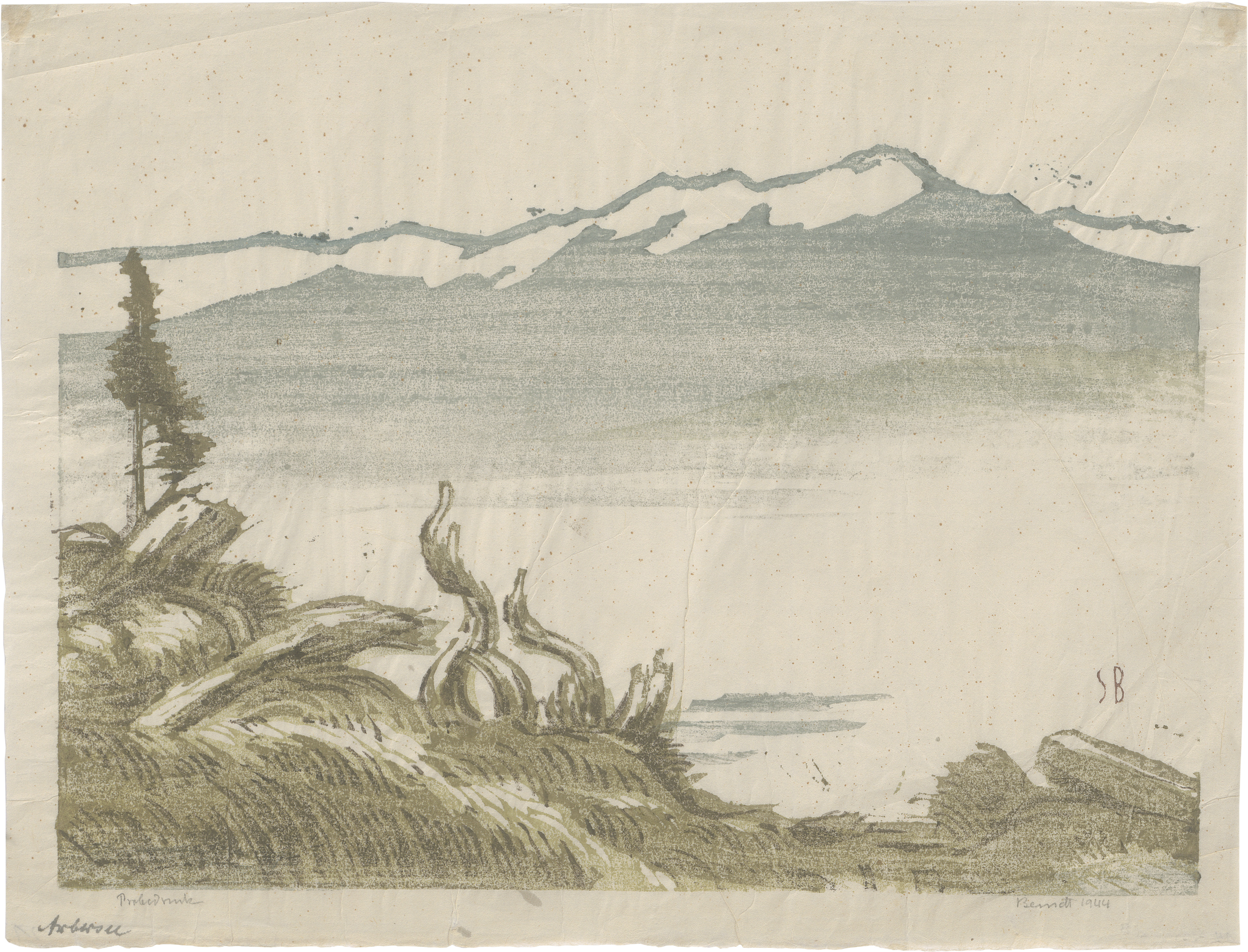 Über den Arbersee fällt der Blick auf den großen Arber im Bayerischen Wald. Der anthroposophische Künstler Siegfried Berndt wird der "Verschollenen Generation" zugerechnet. Prachtvoller Druck mit dem wohl vollen Rand, unten mit dem Schöpfrand. Äußerst selten.