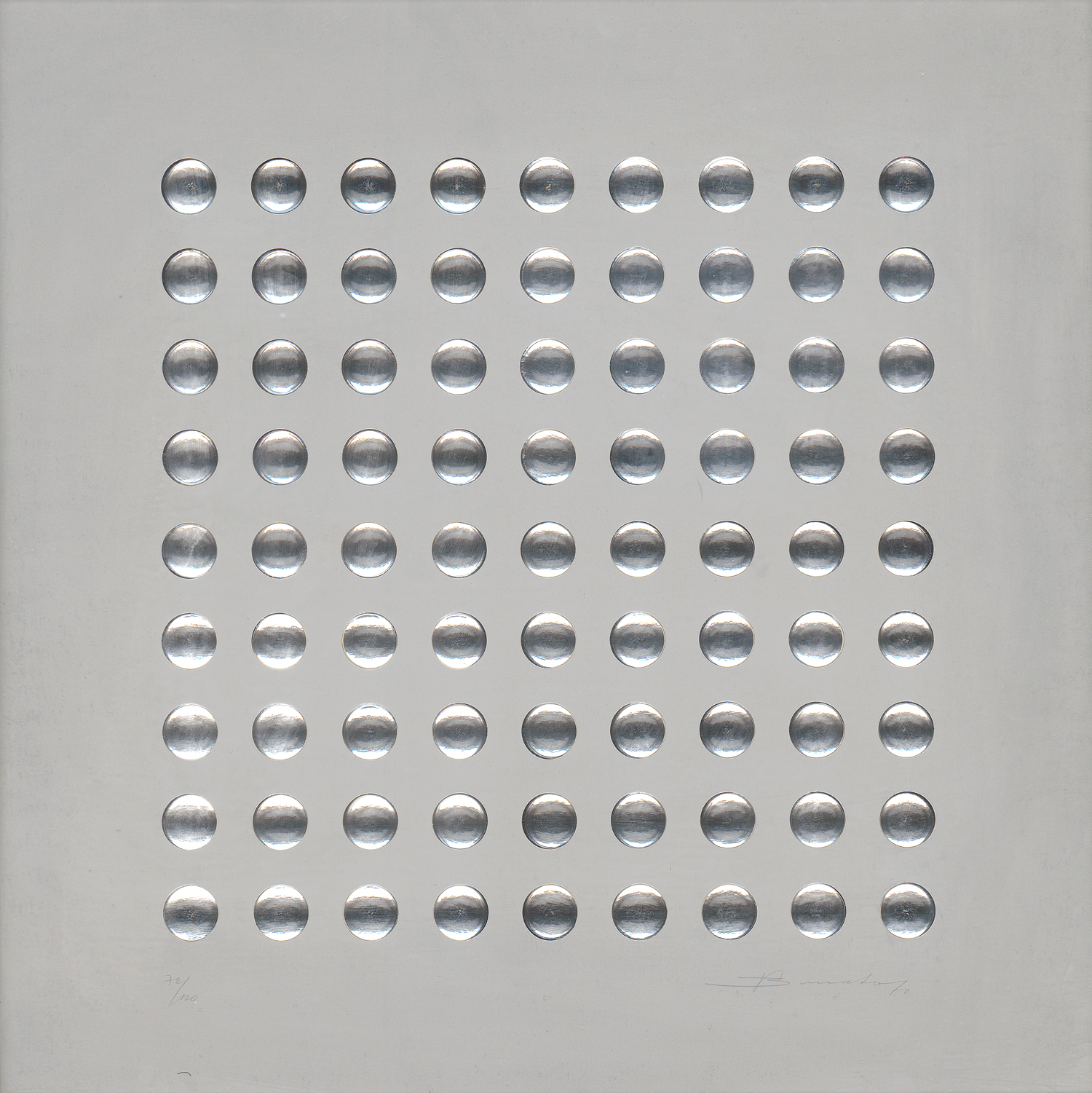 Matte silberne Kreisflächen und spiegelnde Wölbungen ergänzen sich zu einer quadratischen Komposition. Bonato war Mitbegründer der Kölner Künstlergruppe K-66 und erlangte vor allem mit seinen verformten Spiegelobjekten Bekanntheit.
